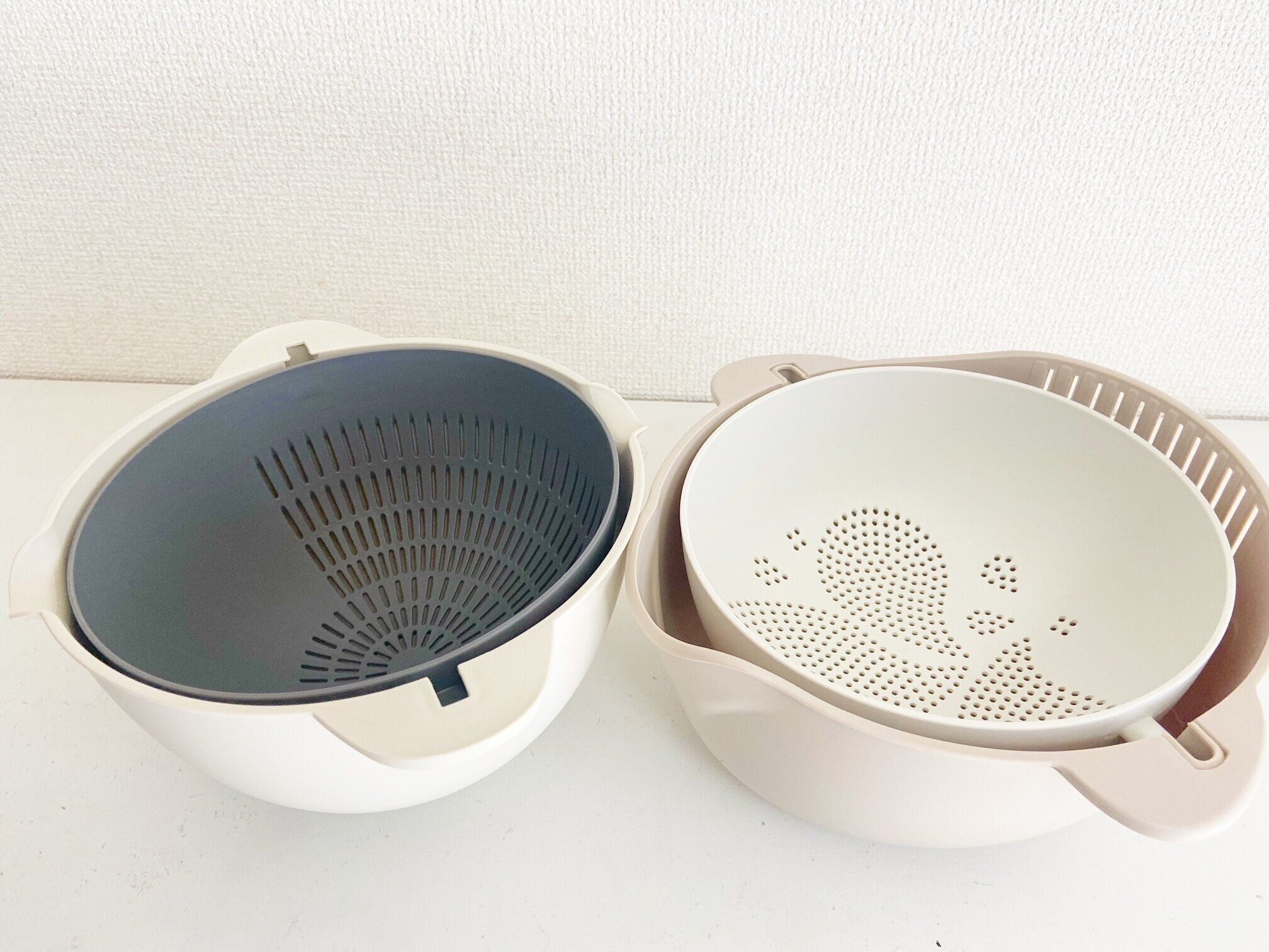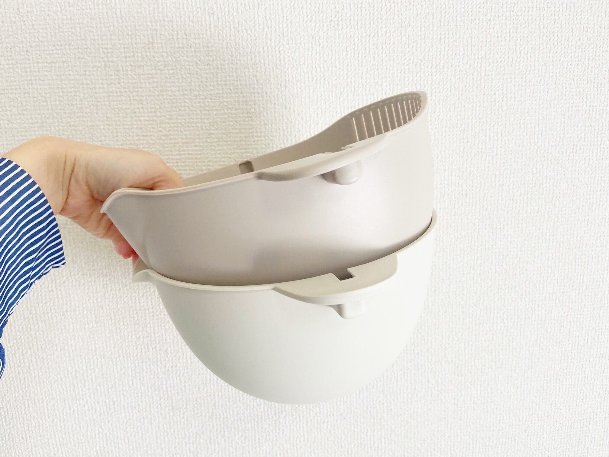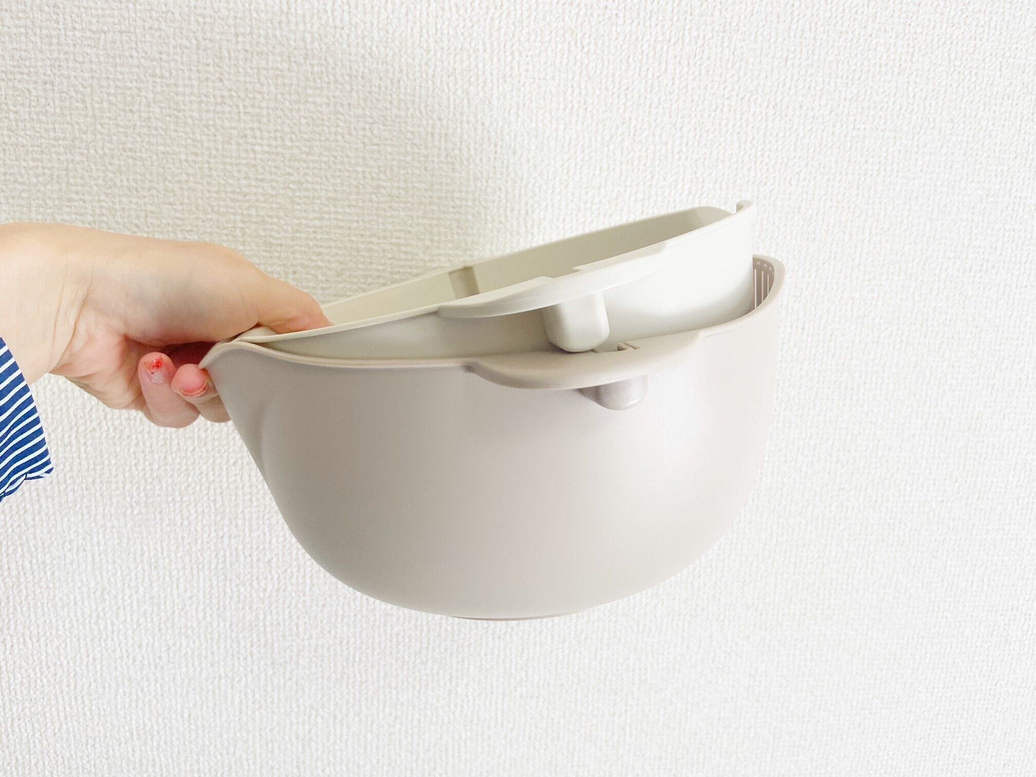 じつは新旧バージョンで「ザル&ボウルセット」そのものの「形状」が改良されています。旧バージョンは少し独特な形をしているので、ほかの調理器具と重ねると少し飛び出してしまいおさまりが微妙です。ボウルとしては使い勝手も満足していましたが、収納方法はしっかり決めておかないとデッドスペースができちゃうのが難点。