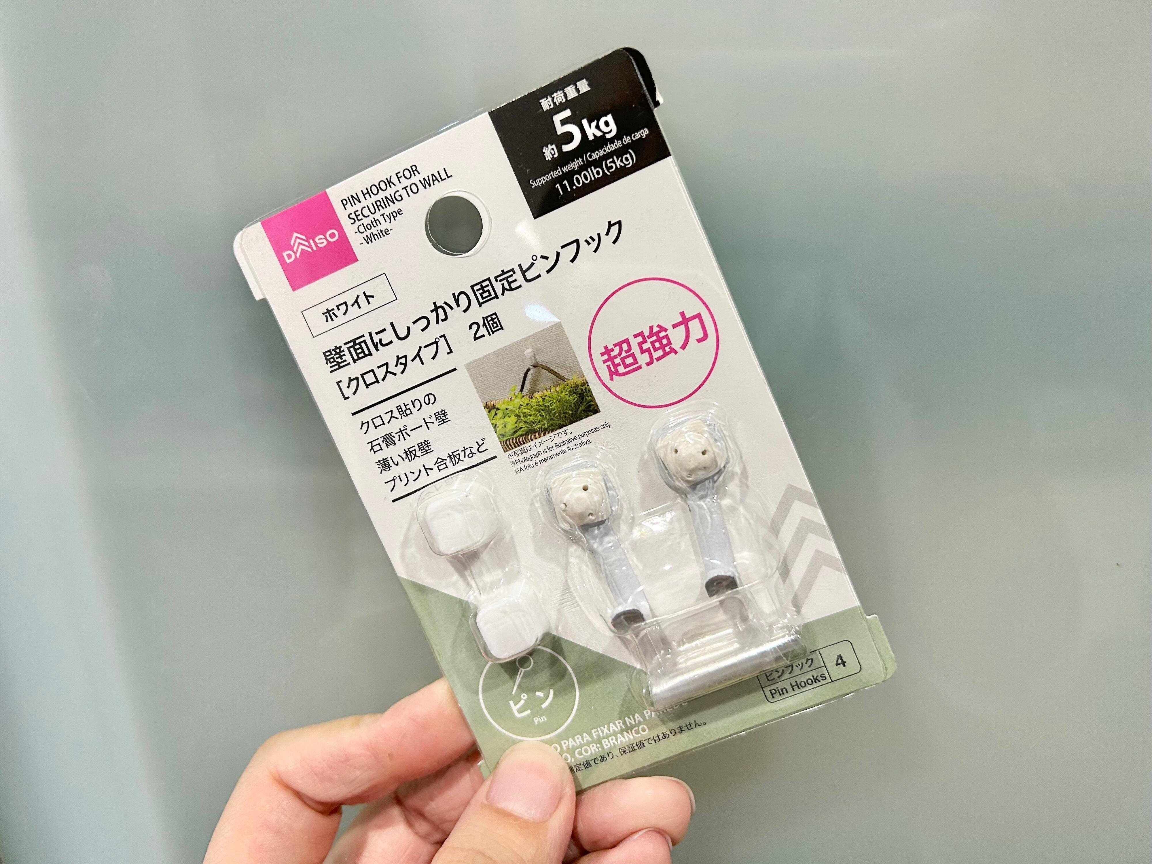 同じくダイソーで販売している石膏ボード壁に対応したピンフックなら賃貸でも取りつけ可能です。
