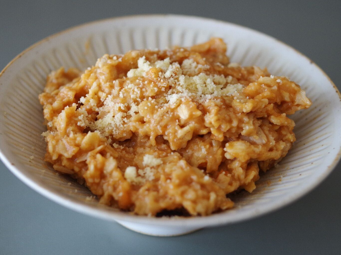 ロールドオーツオートミールのパッケージの裏に書いてあったトマトリゾットを参考に、水とトマトクリームポタージュのもとだけでつくってみたのがこちらです。トマト缶とコンソメでつくると量が多くなってしまいますが、トマトクリームポタージュのもとなら好きな分量に調節しやすく、お手軽。