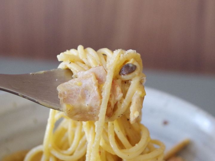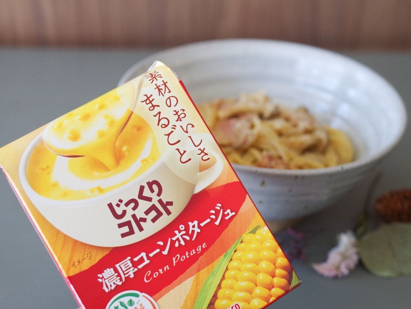 気になる味は、コーンポタージュの甘みがあって少し和風な味わいが、かえって新鮮。完全なホワイトソース系のパスタとは違いますが、食べたことのないパスタができました。
