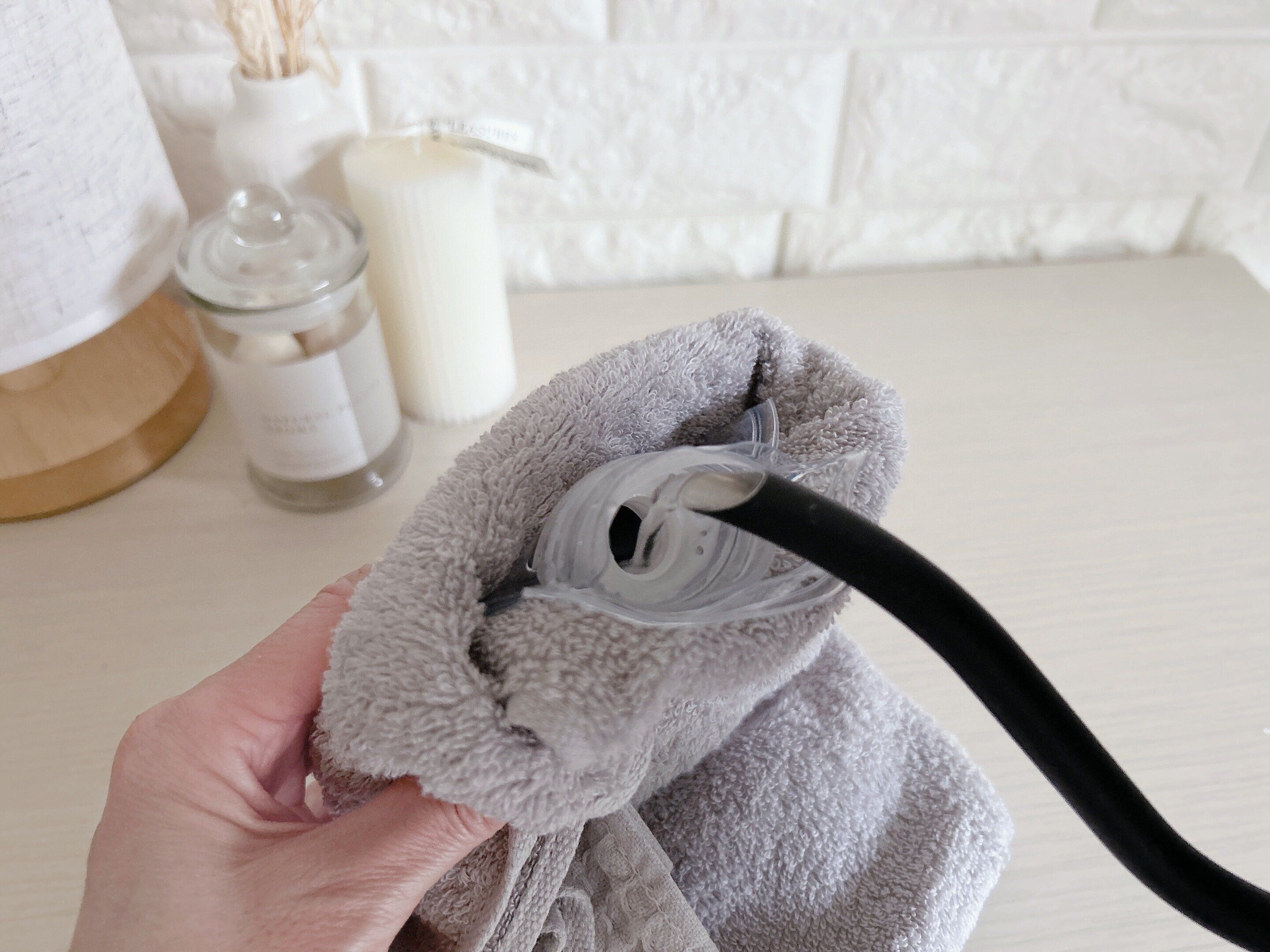 80℃のお湯を注ぐとき熱いので、お手持ちのタオルなどを本体に巻いてからお湯を入れます。