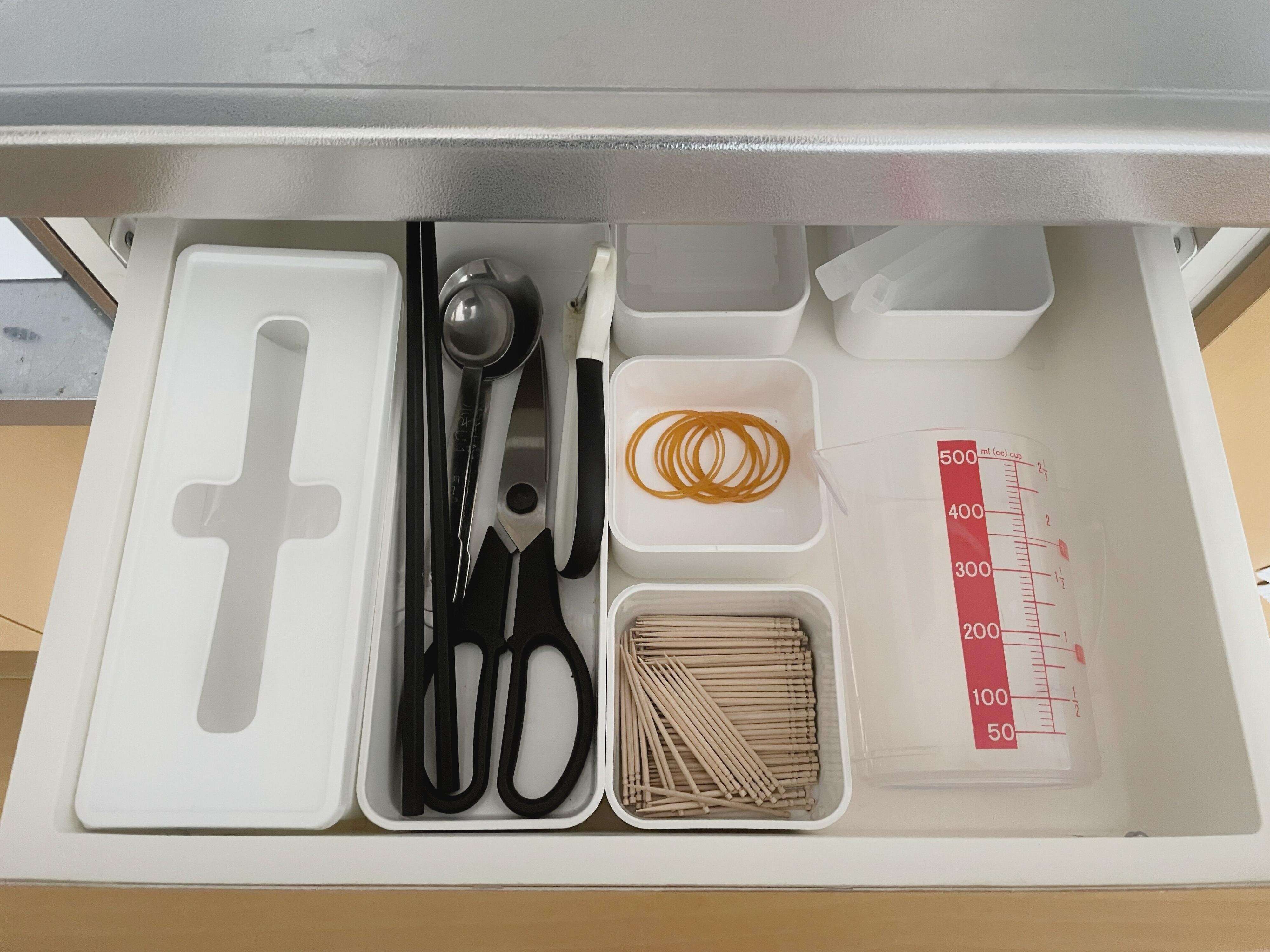 一日の中でも特に立つことの多いキッチンでは、引き出しを開けたらすぐに出して使える、前述の浮かせる収納でワンアクションで取れて使えるようにしておくと、料理をさらに効率よく進めることができるようになります。