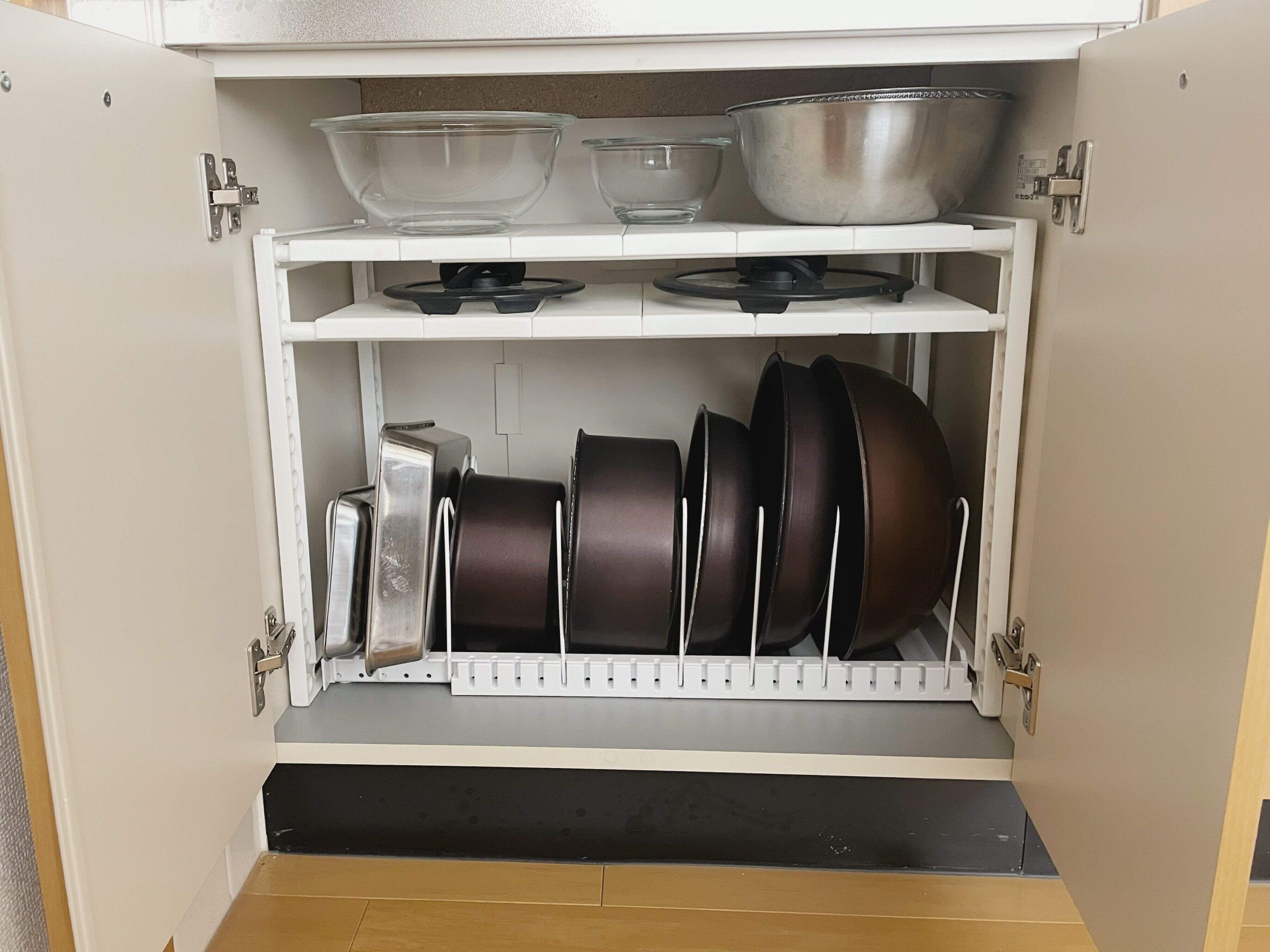 ものが増えやすいキッチンだからこそ、よく使うもの、あまり出番のないものの区別をしっかりつけて収納するようにしています。