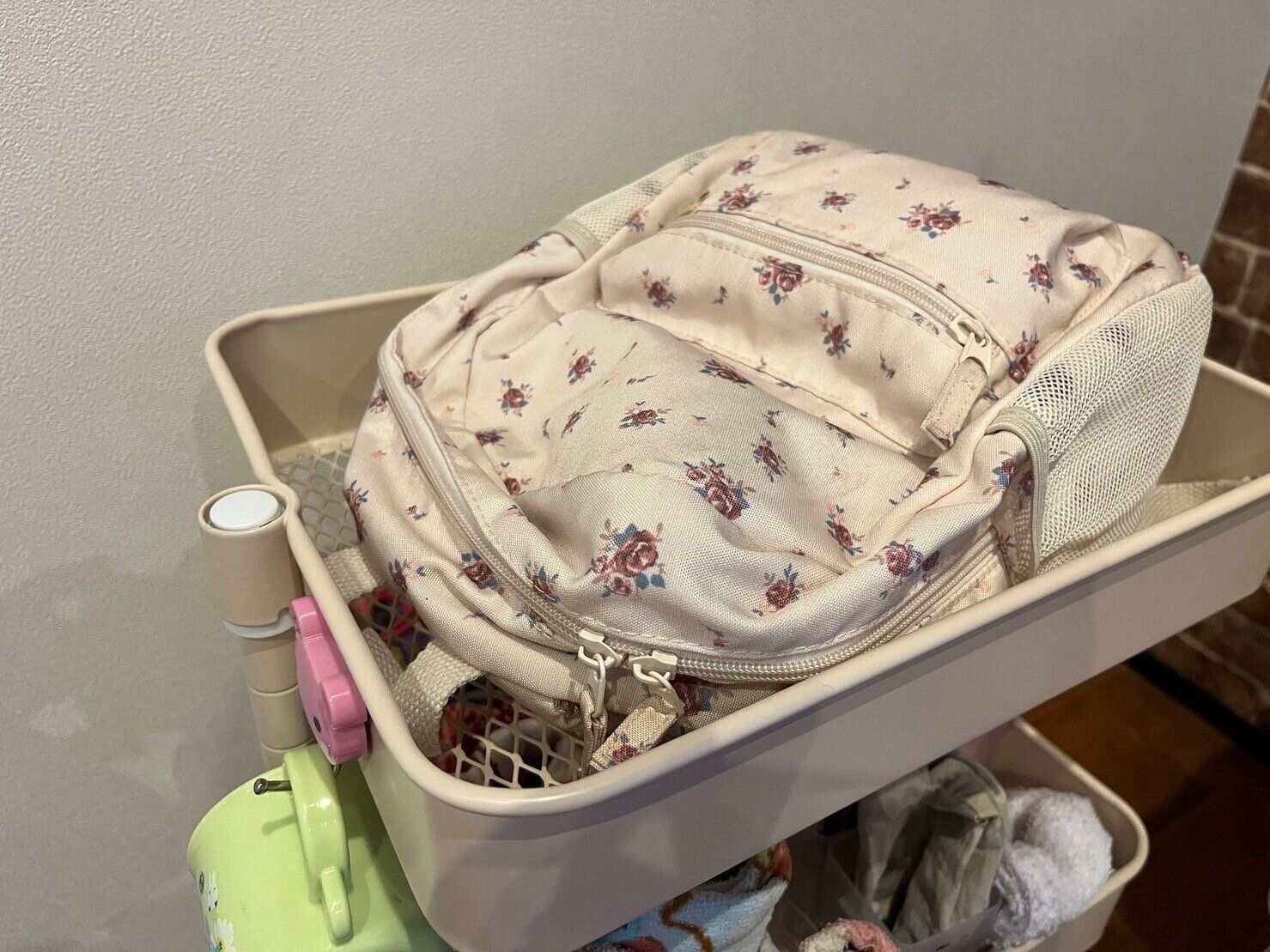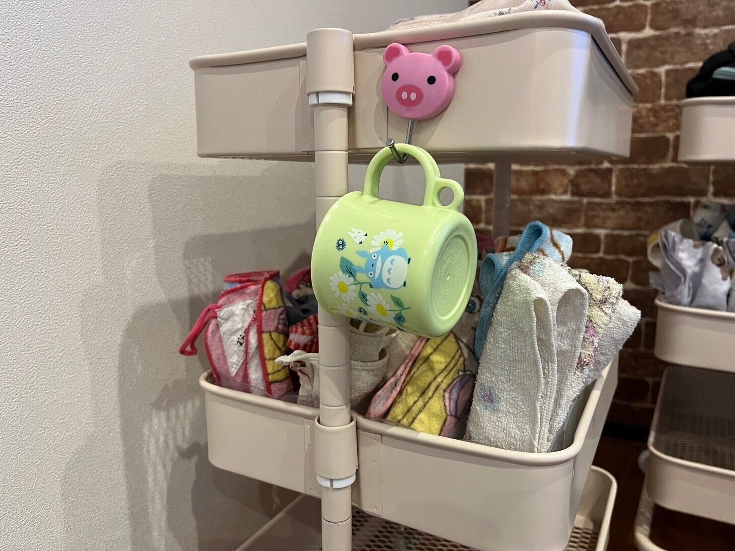 毎日ワゴンの中から必要なものを取り出すことで幼稚園児でも自分で支度ができるようになりました。小学校に上がったら子ども部屋に移動してランドセルや教科書などを入れるようにするつもりです。