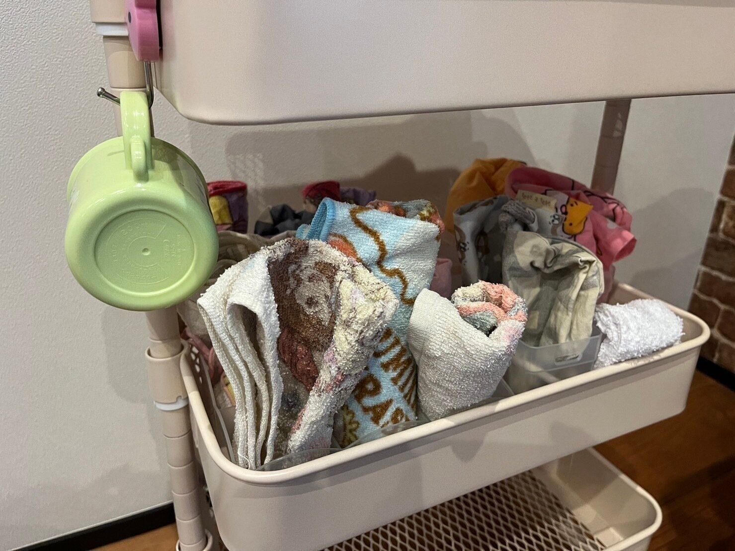 真ん中の段にはタオル、おしぼり、ランチマットなど幼稚園で使用する布ものを入れています。収納に使用しているのは100円ショップの商品で、本来は靴下や下着などの収納に使うものだと思います。