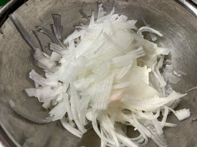 大根をスライサーで千切りにします。包丁で千切りにしても良いと思いますが