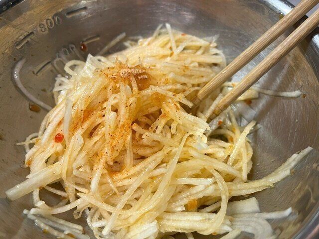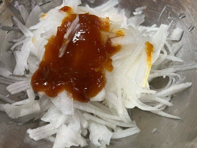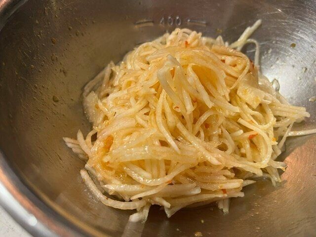 千切りにした大根に1袋目のソースを混ぜ合わせます。