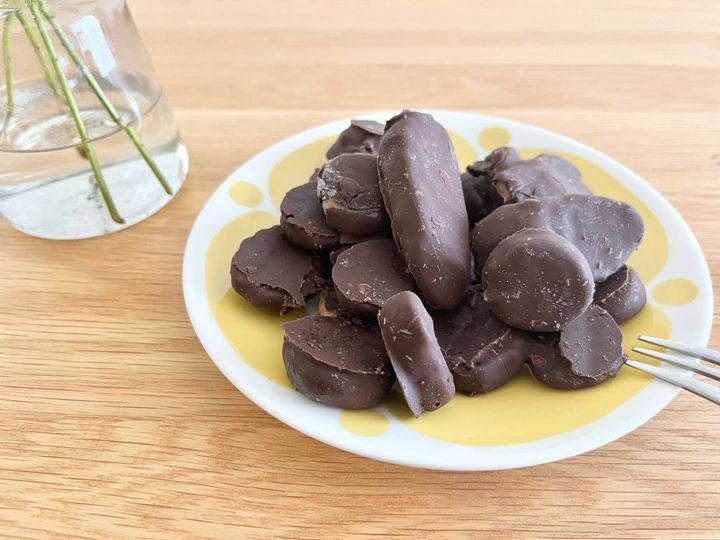 屋台でおなじみのチョコバナナと言えば、片手でも食べやすいように串や割り箸にバナナが1本そのまま刺さったものが一般的。ですが、業務スーパーのチョコバナナは、食べやすいように1口サイズにカットしたバナナを、チョコレートでコーティングしています。
