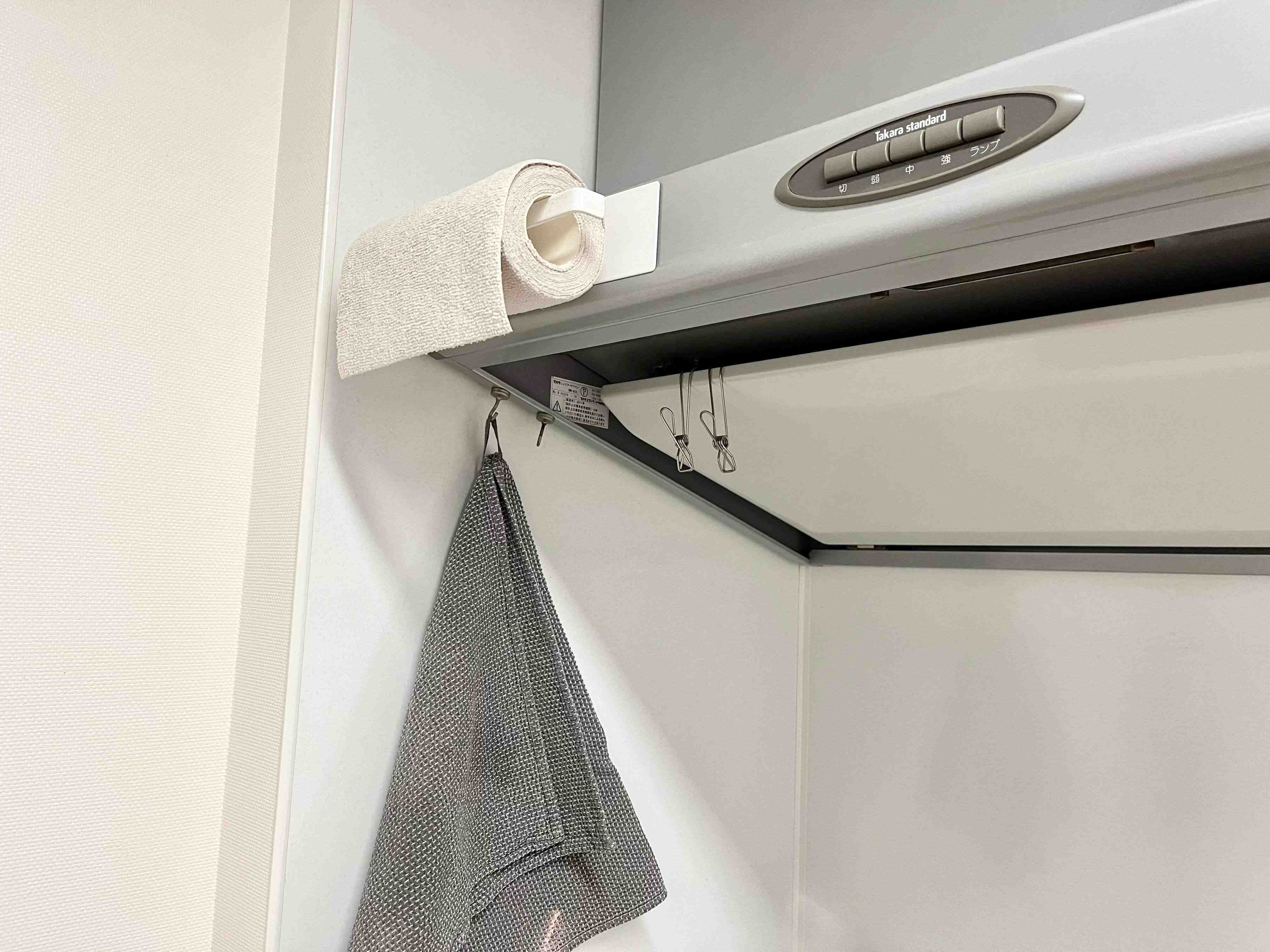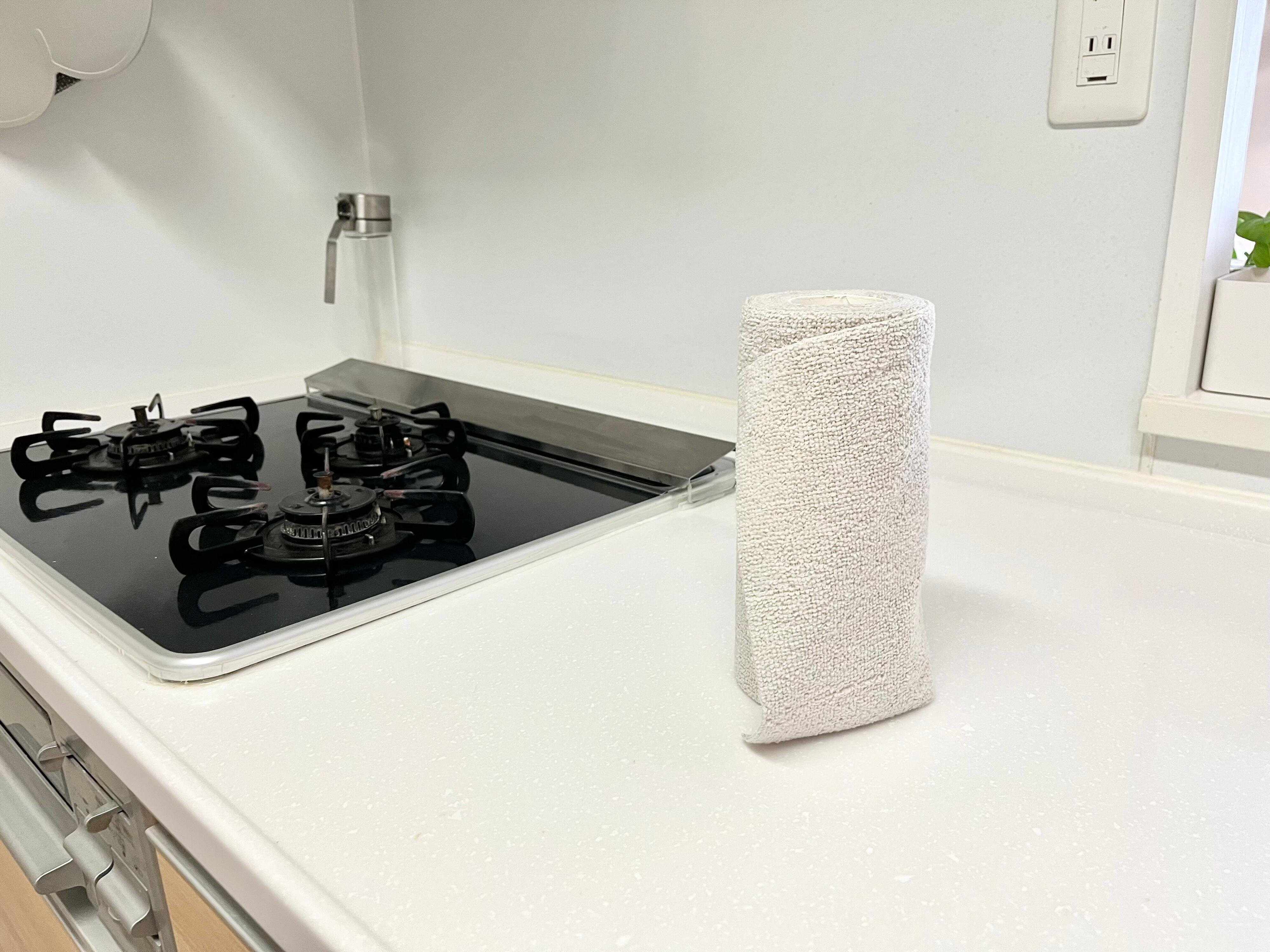 「マイクロファイバーロールふきん」のもう1つの魅力は、ロールタイプなので置き場所に困りにくいというところです。キッチンペーパーホルダーを使用すれば、使いやすい場所に手軽に置くことができます。引き出しなどに入れておく必要がないので、ワンアクションでサッと手に取れるので作業効率も上がります。