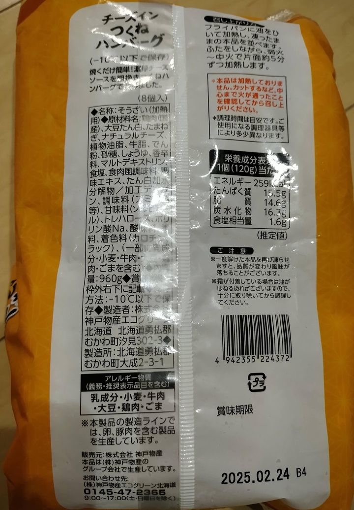 業務スーパーのチーズインつくねハンバーグに、メインで使われているのは鶏肉です。そのためか、価格はたいへんリーズナブル。お値段は安いですが、「神戸物産エコグリーン北海道」という北海道にあるグループ会社でつくっているそうです。