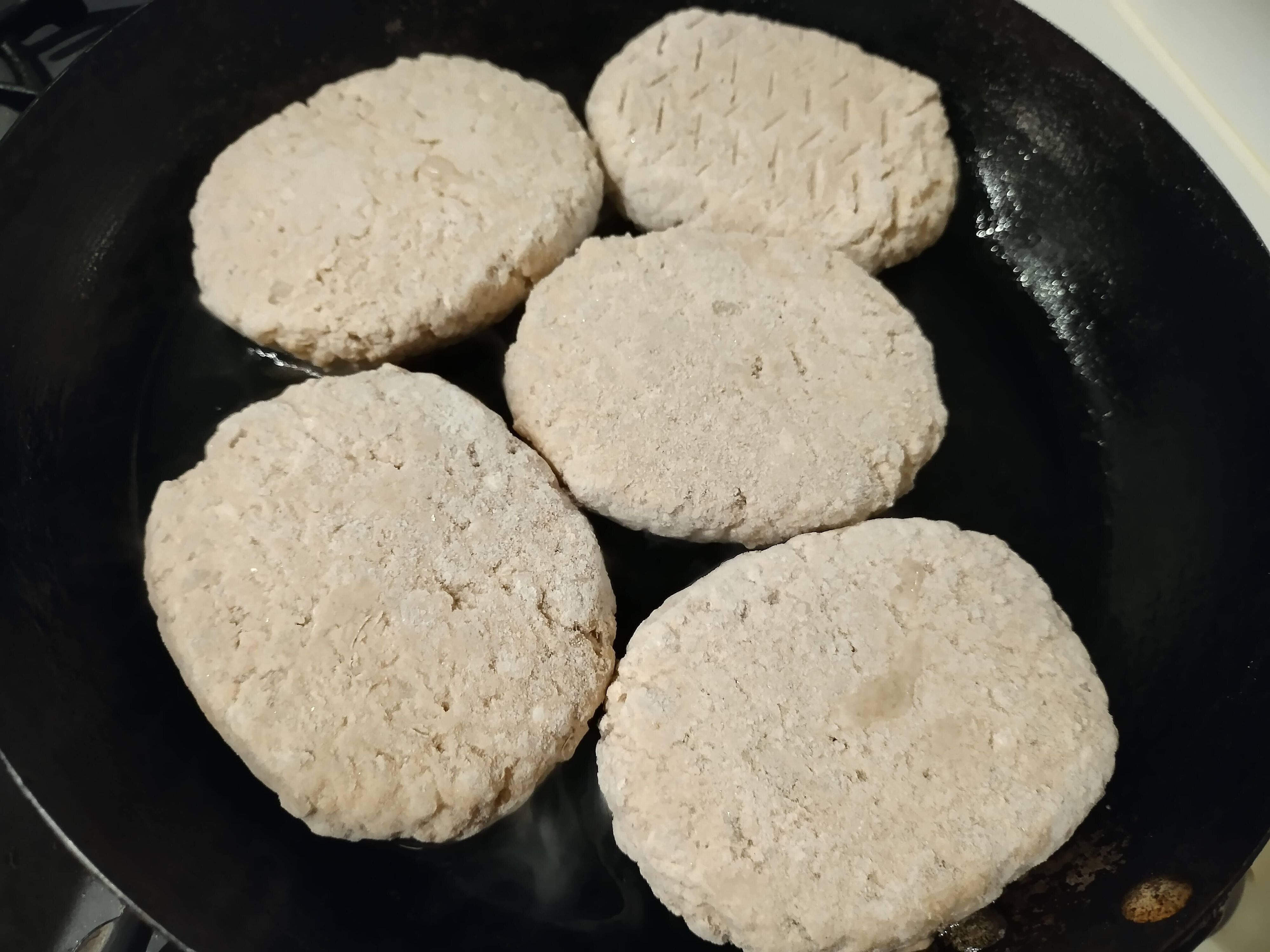 業務スーパーのチーズインつくねハンバーグは、未加熱品です。そのため、フライパンでしっかり火を通す必要があります。弱火から中火で片面5分ずつ加熱していきます。焦げやすいのでご注意ください。