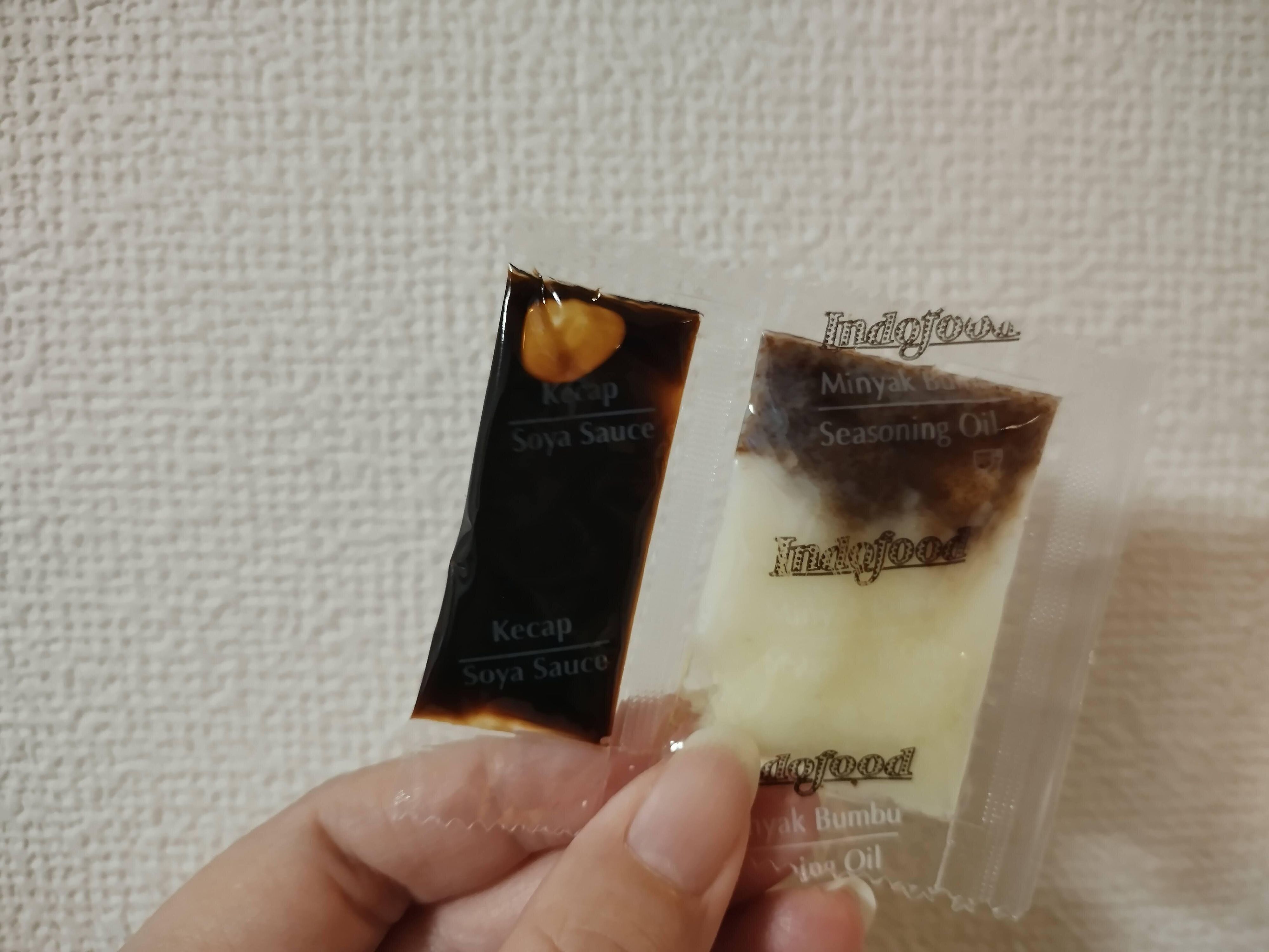 右側の2層に分かれた調味料。開けるときは茶色の層に近い方からハサミを入れるのをおすすめします。オイル(白い部分)と調味料(茶色の部分)が分離して2層になっているのですが、この茶色の層はとっても出しづらいんです。白い方から開けてしまうと袋に残ってしまう可能性も。