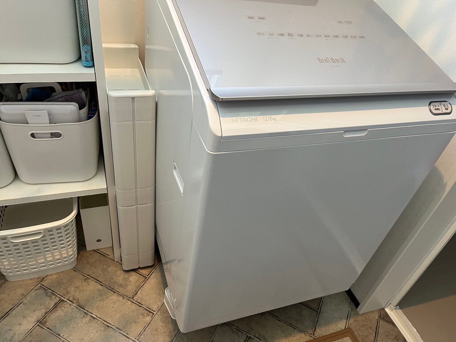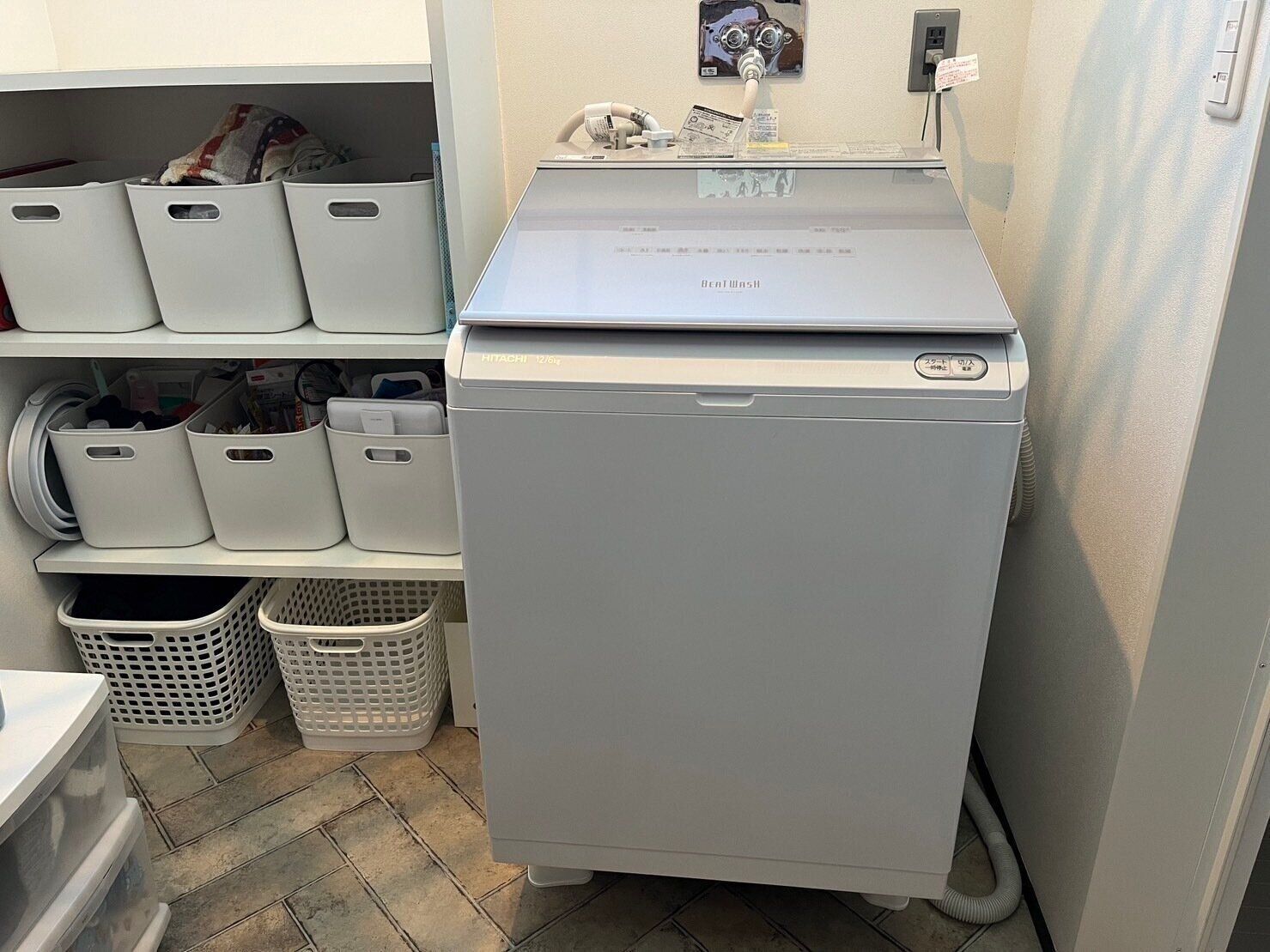 わが家の脱衣所には洗濯機置き場の横に備えつけの棚があります。(棚の収納には無印のやわらかポリエチレンケースを使用しています。)