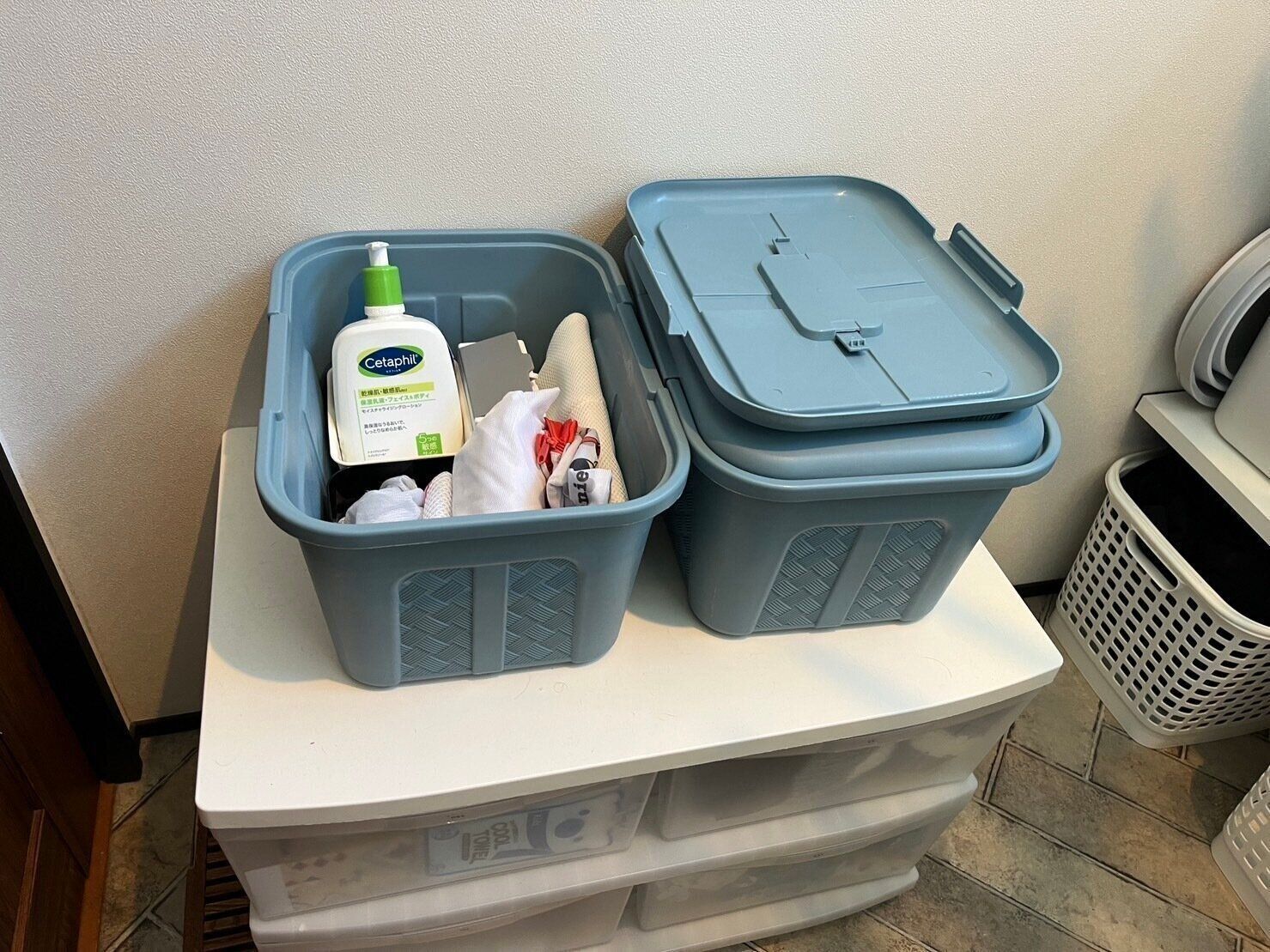 ここにはおもにバスタオルや日用品のストック、掃除用品などが置いてあるのですが、これだけでは足りず下着や子どもたちのパジャマなどは別の収納ケースに入れています。