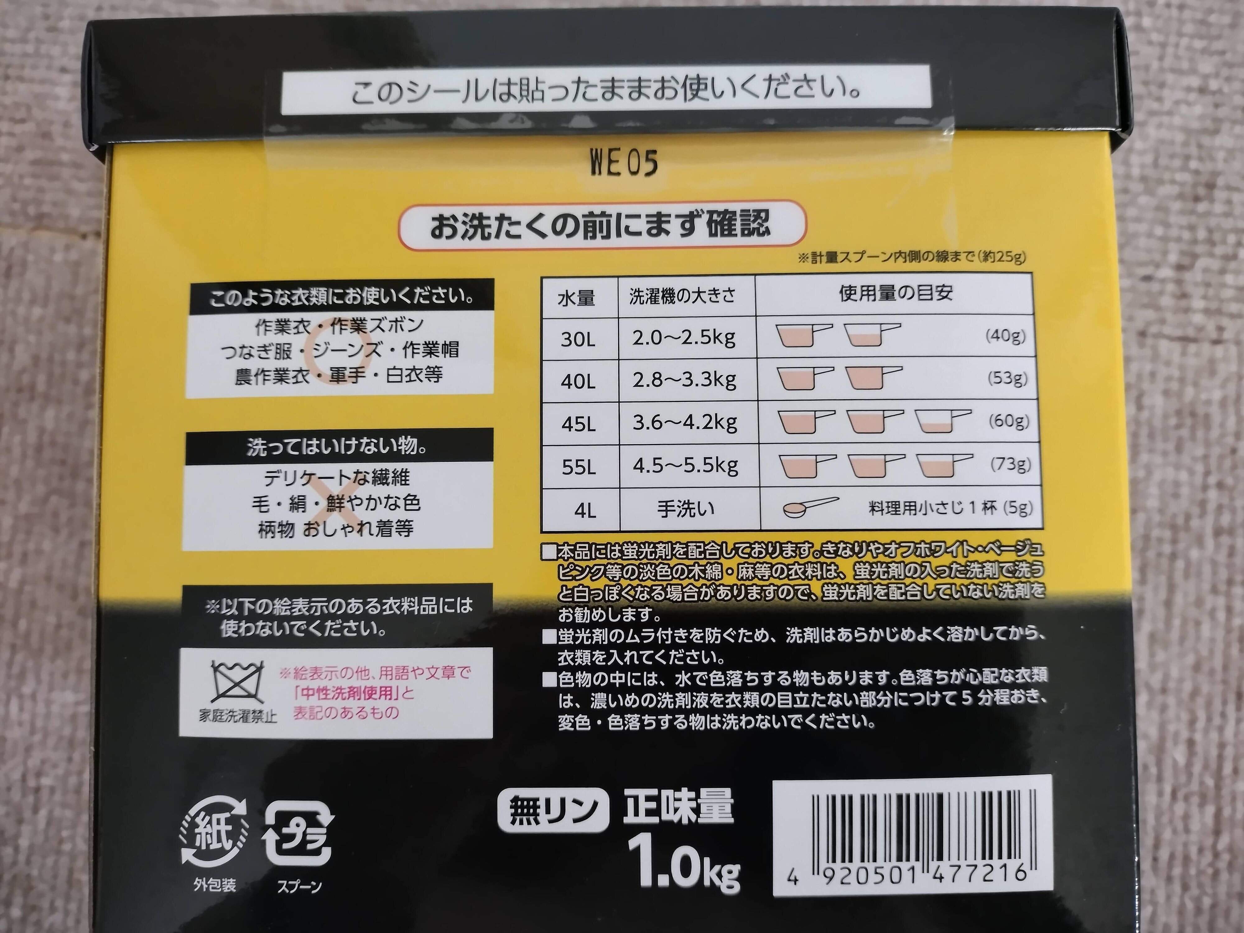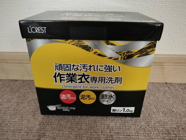 「L'CREST」には、作業着用粉洗剤もあるんです。こちらは上記のホワイトバイオよりもややお値段設定が高めで、多く洗剤を使います。