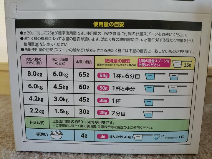 「L'CREST」の作業衣専用洗濯洗剤は、1箱1kg入りで348円(※筆者購入時)。45Lの水で洗うときは60gの洗剤を使いますので、1回あたり20.88円となります。