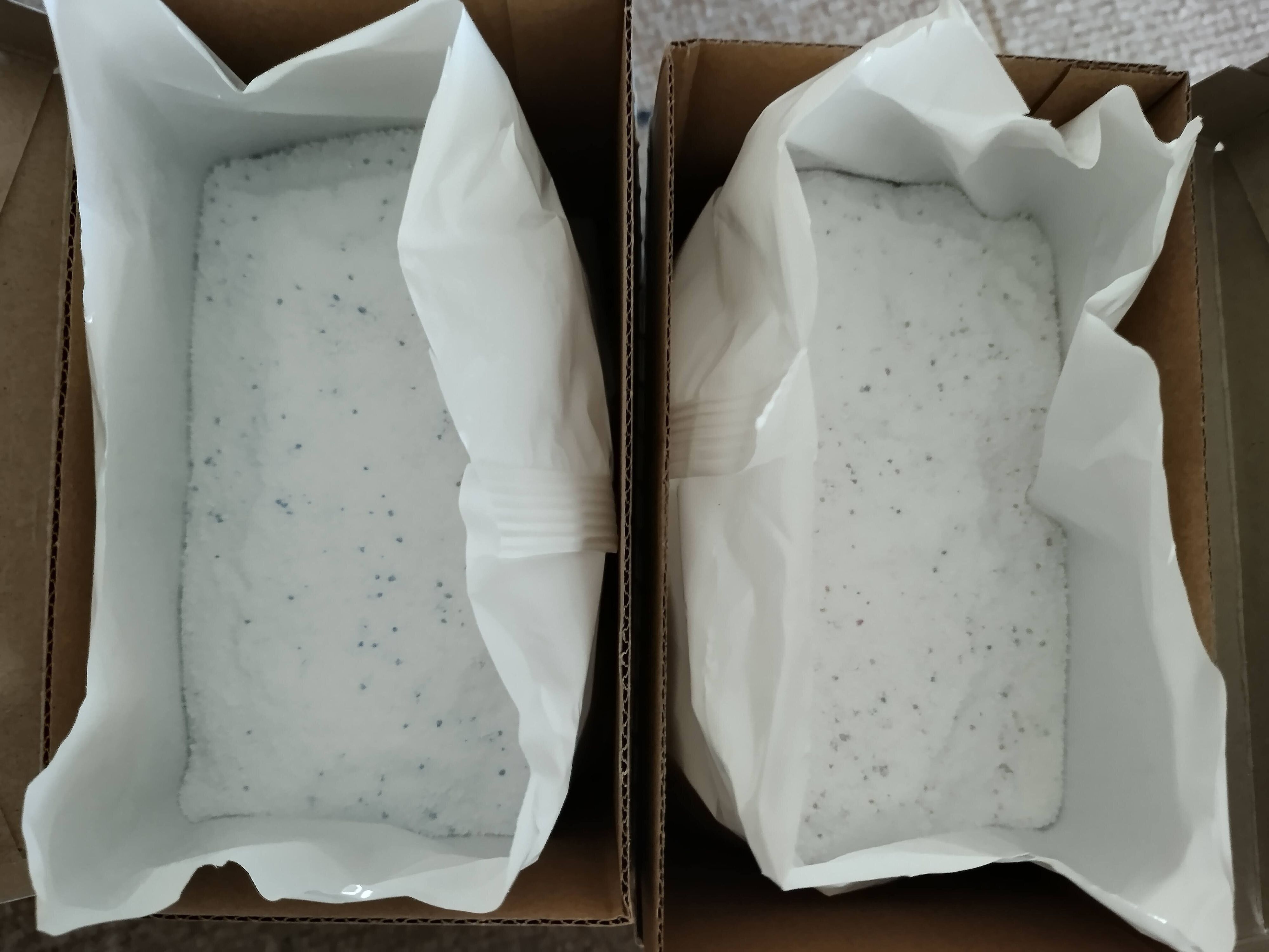 柔軟剤入りの香りのホワイトバイオの方は、 青いつぶつぶとピンクのつぶつぶが入っていました。一方、白さのバイオの方は青いつぶつぶのみ。どちらもさわやかな洗い上がりが特徴です。ピンクの箱の香りのホワイトバイオも柔軟剤入りとのことですが、柔軟剤の香りはそれほど強くなく、とても使いやすい洗剤です。