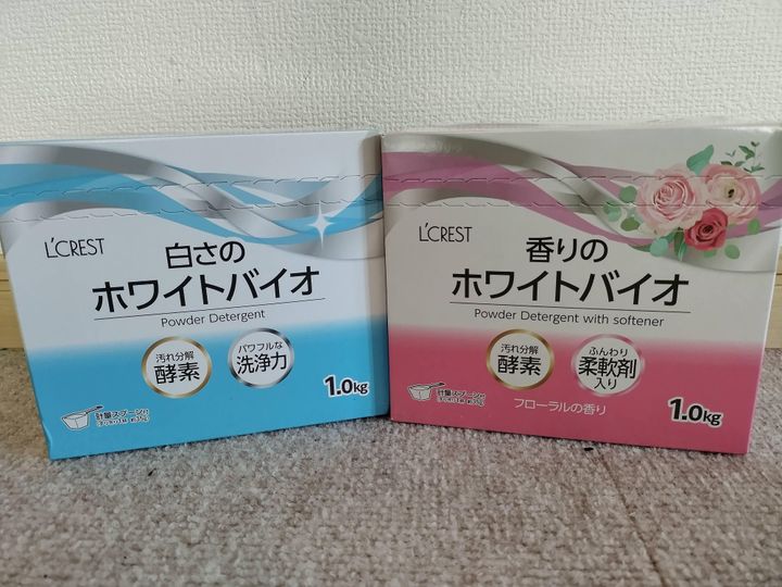 「L'CREST」洗濯用粉洗剤には、柔軟剤入りの「香りのホワイトバイオ」と漂白剤入りの「白さのホワイトバイオ」があります。計量スプーンも入っています。
