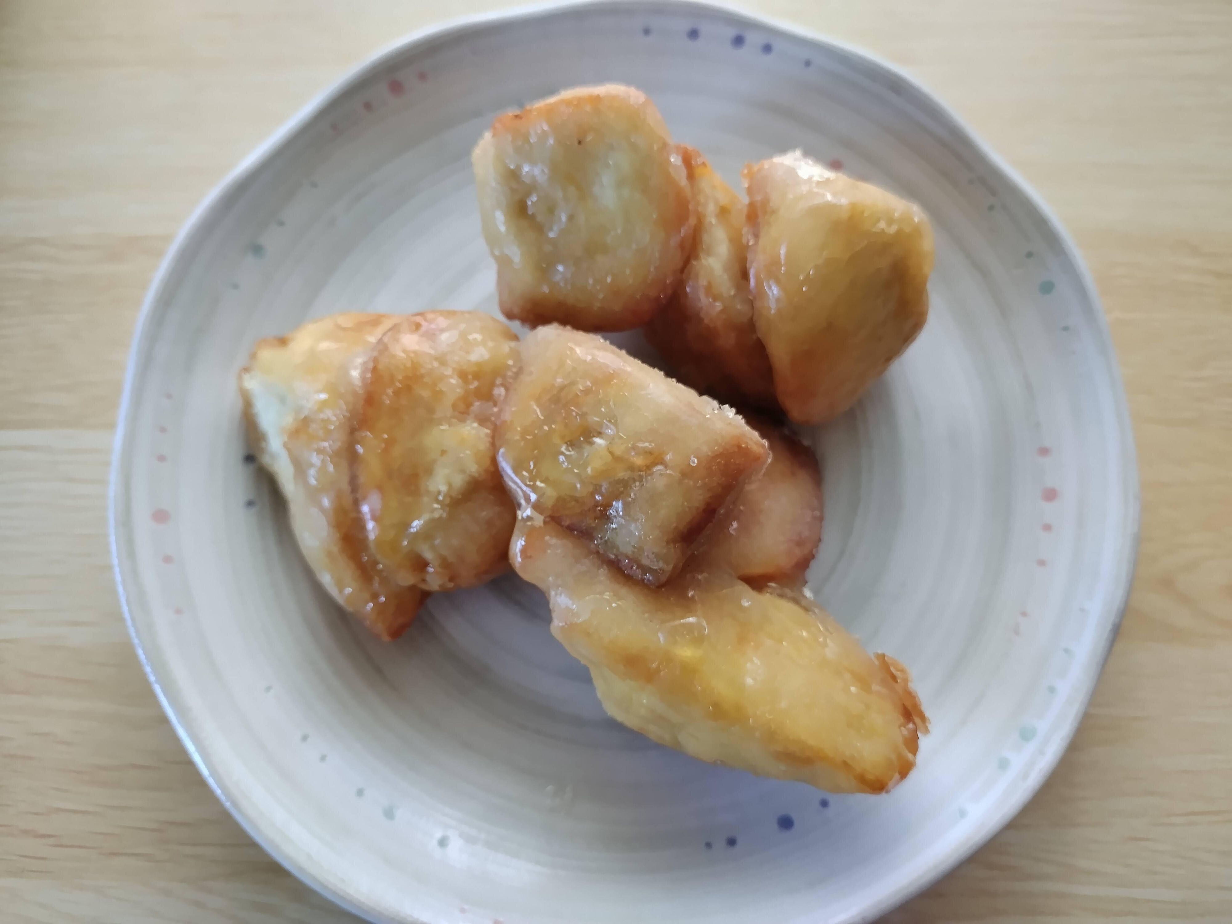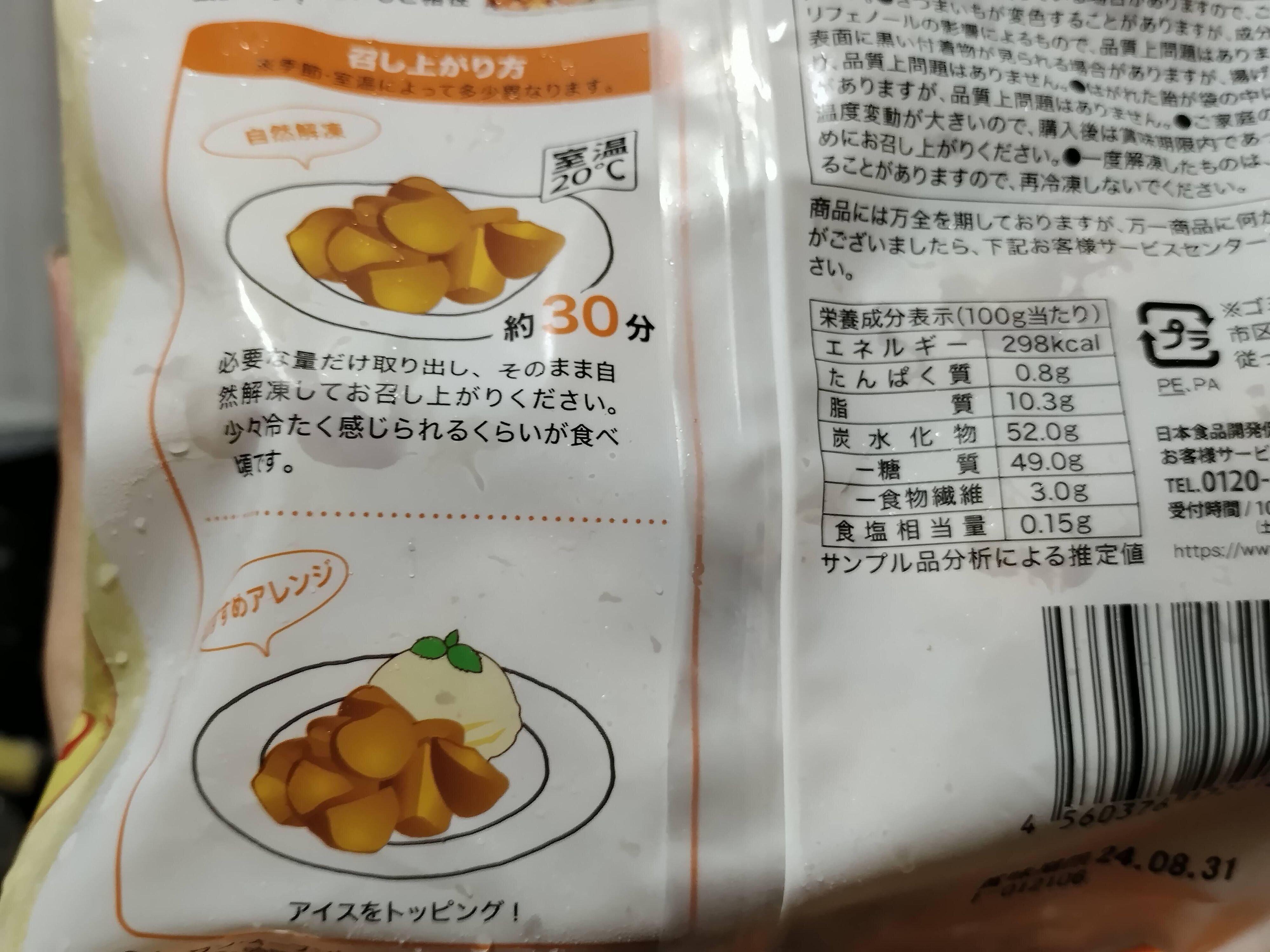 解凍してすぐは水あめがカリッとしていますが、自然解凍して時間が経つとさつまいも自体の水分などで、水あめが溶けてしまいます。カリッとした食感がなくなるだけでなく水っぽくなってしまうので、解凍したらなるべく早めに食べるのがおすすめです!