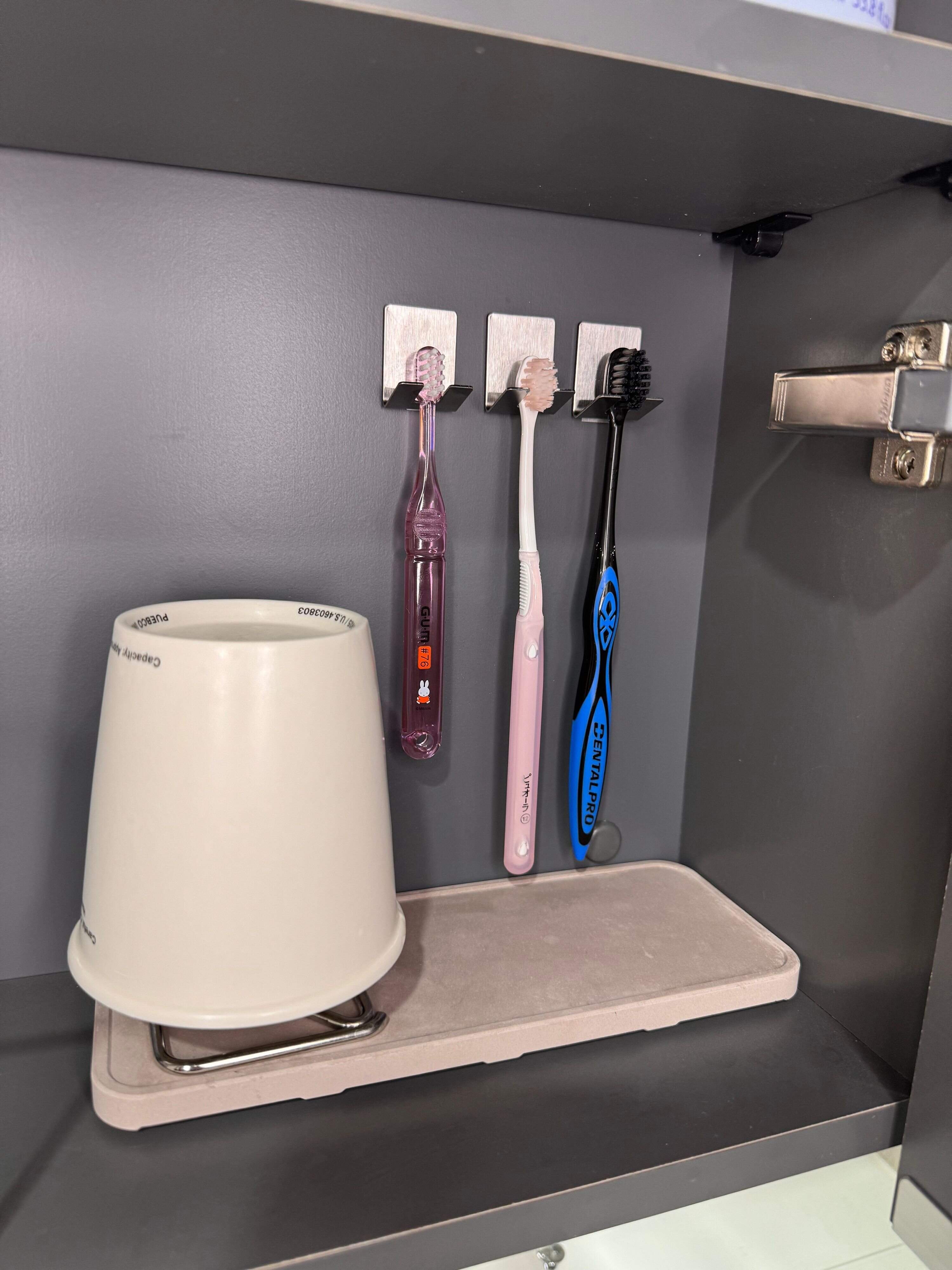 歯ブラシは洗面台に水滴が落ちるように置いておくのが一番清潔だけど、出しておくと生活感が気になる。