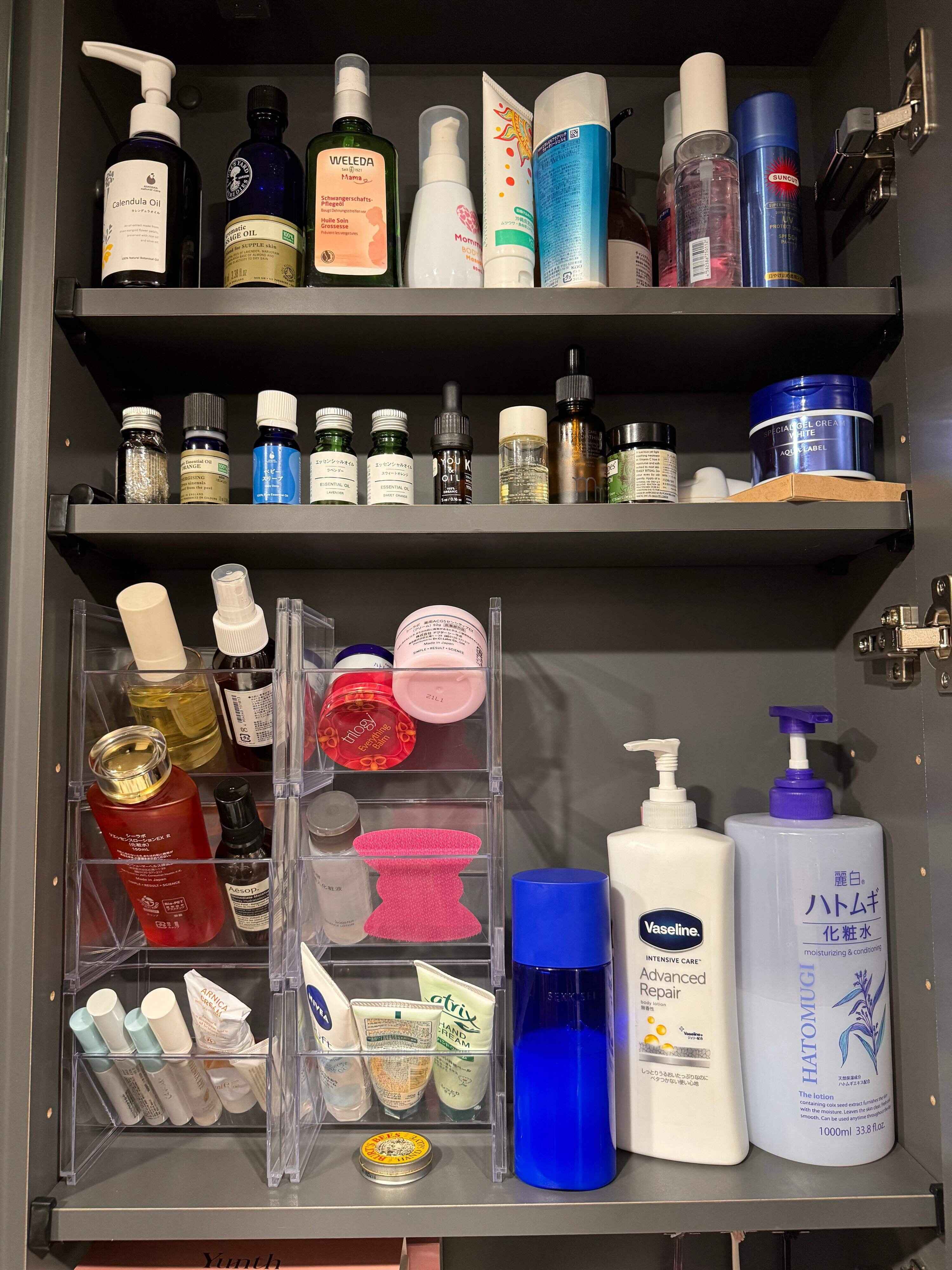 洗面台に化粧水や乳液を並べると、後ろのものを取る時に前のものが倒れてしまうことってありますよね?