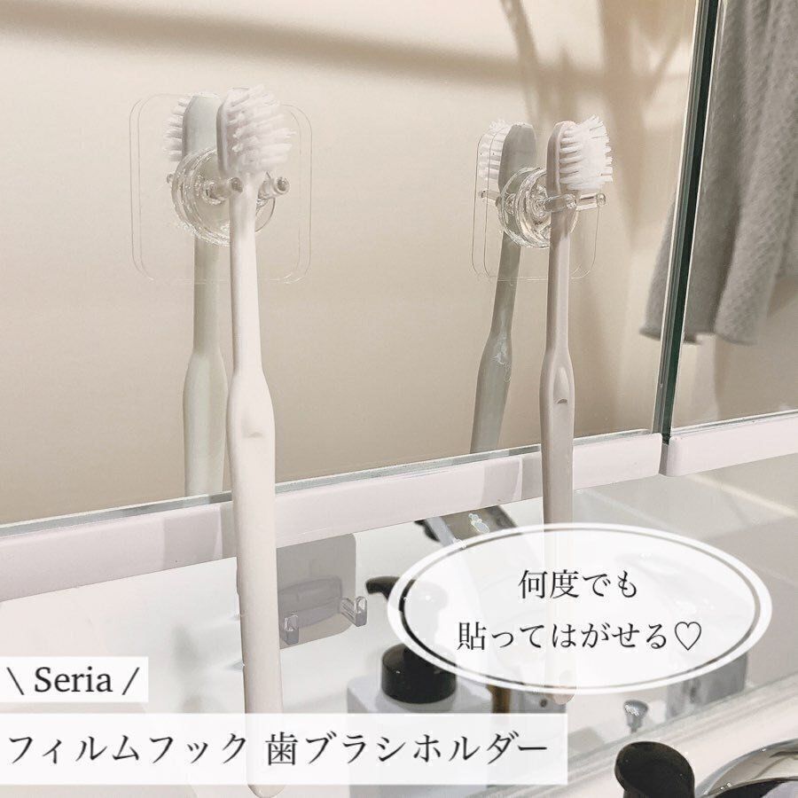大人気のフィルムフックシリーズの歯ブラシホルダーです。歯ブラシを浮かせて水切れよく収納できます。透明なので目立たないのもいいですよね。