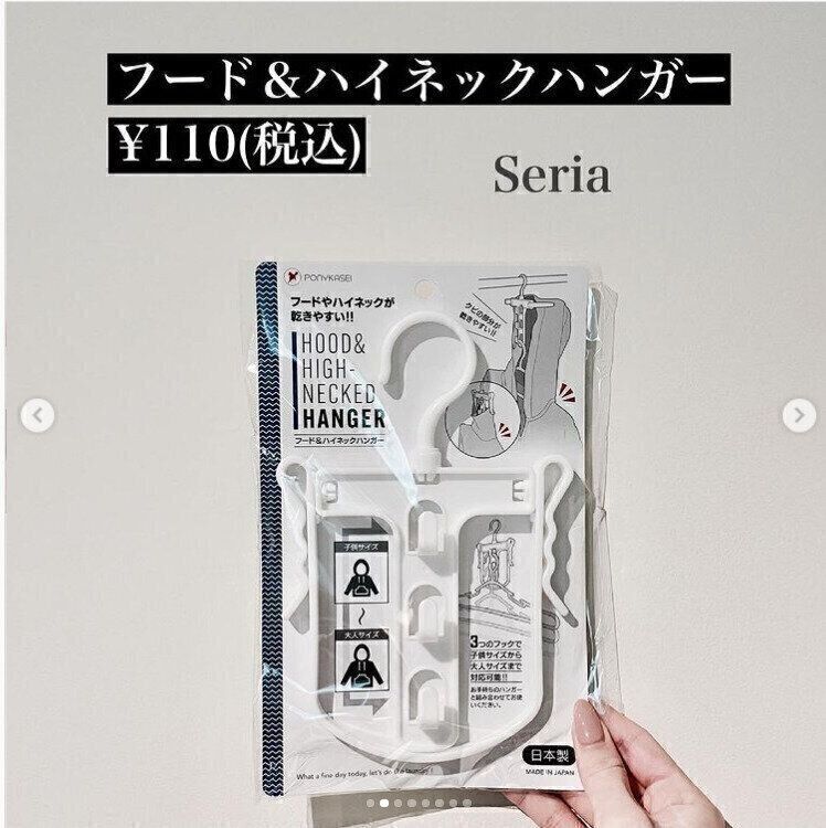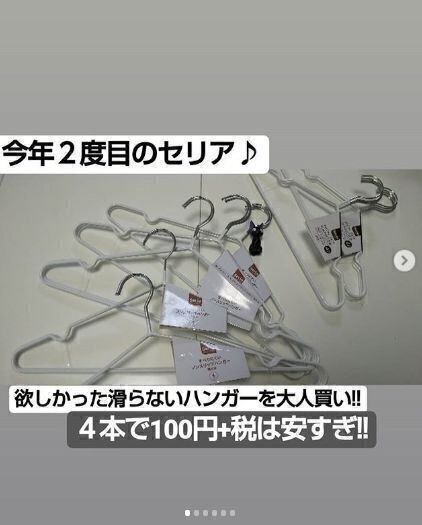 セリアで人気のアイテム、滑りにくいハンガーは4本で110円です。少し小さめのサイズの子ども用も同じ値段。色はホワイトとグレーがあります。洋服が滑らずにかけられるので、ずり落ちずに洋服がとりやすくなります。デザインもシンプルで使いやすいハンガー。クローゼットの中がすっきりしそうですね。