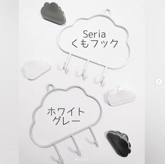 セリアの雲シリーズ。こちらはフックになっているので、玄関先にかけて鍵をかけるのにも便利です。ネックレスなどのアクセサリーをかけたり、クローゼットの中にかけてベルトやスカーフなどをかけるのもよいですね。カラーはホワイトとグレーがあるのでお部屋の雰囲気に合わせて使ってみてください。