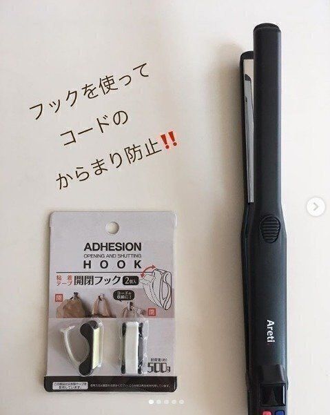 粘着テープで壁などに貼りつけるタイプのフック。ひっかける部分が開け閉めできるので、使わないときでもじゃまにならず見た目もすっきりします。帽子やバッグをかけるだけでなく、コード類のからまり防止にも便利なアイテムです。