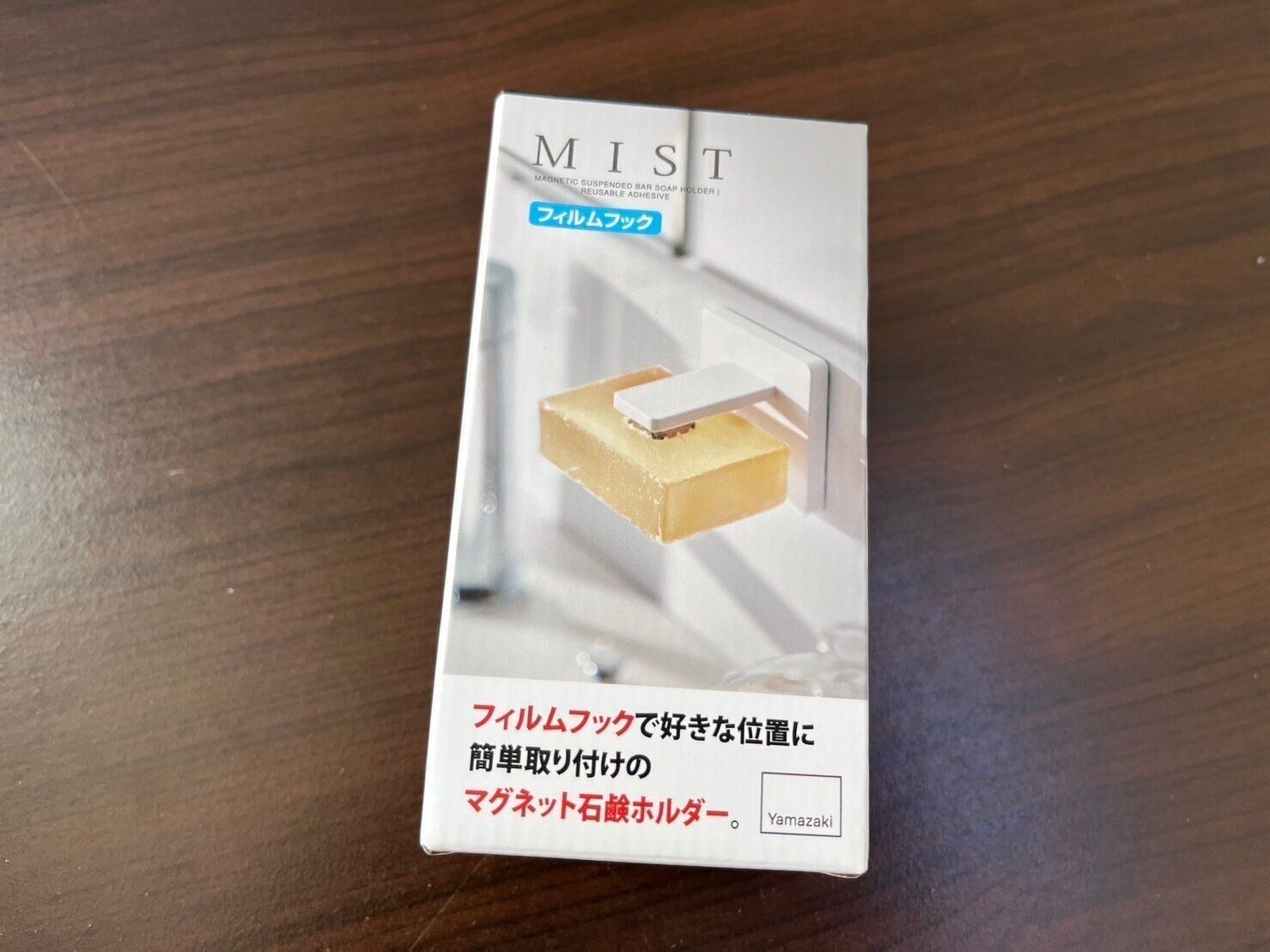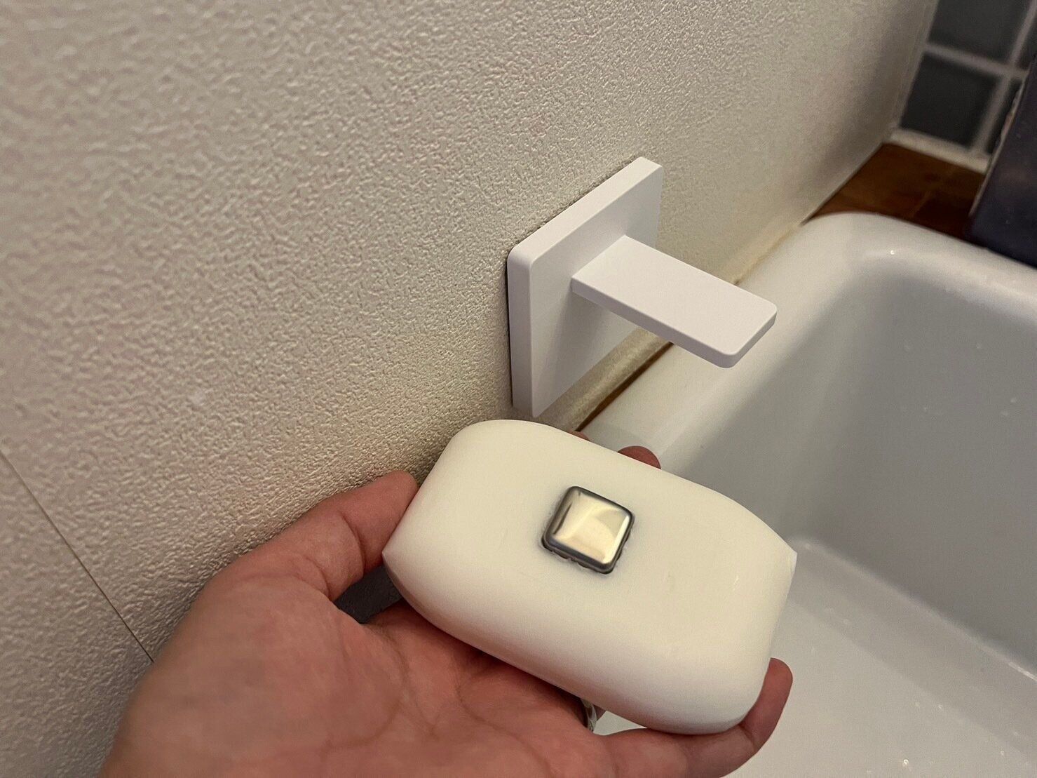 ちなみに、手洗い用の石鹸ホルダーとして使っているのはカインズで購入したフィルムフックで壁に取り付けられるマグネットの石鹸ホルダーです。