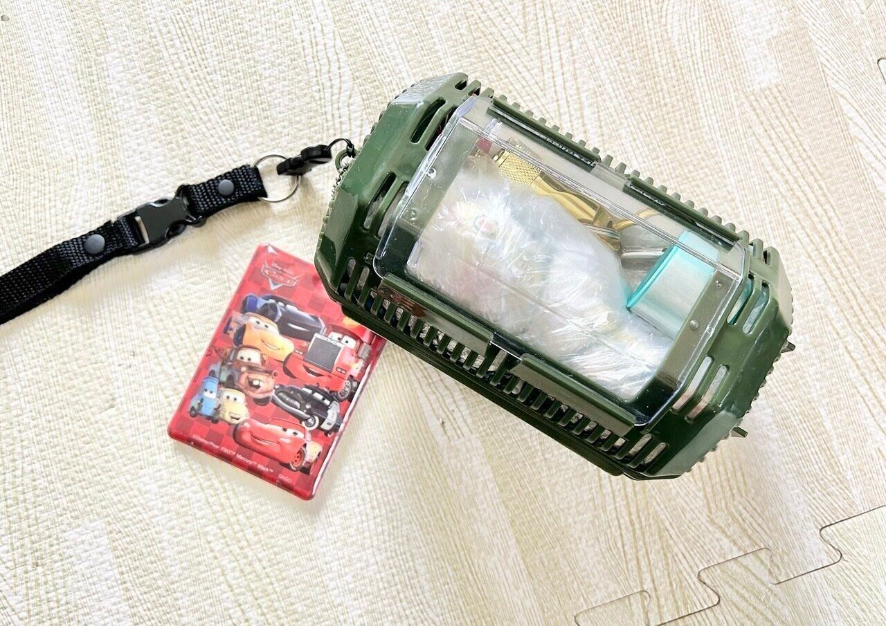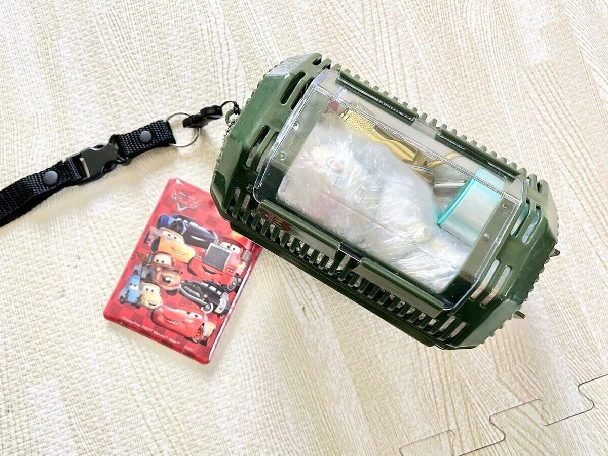 代用できるものを探していたところ、ダイソーで販売している虫かごを発見。スライド式なので子どもでも開け閉めができてストラップで斜めがけにできると感じたのでこれで子ども用防災セットを作りました。
