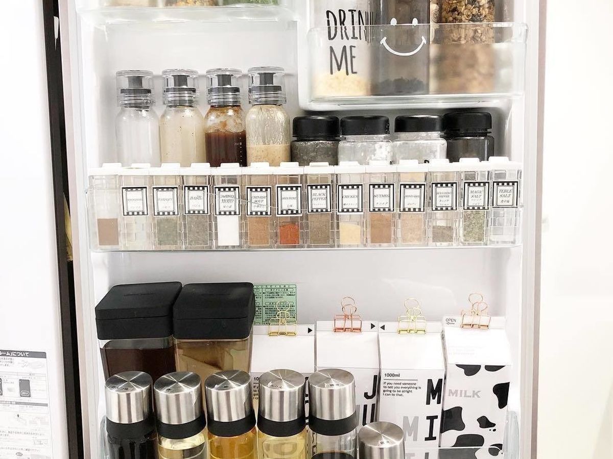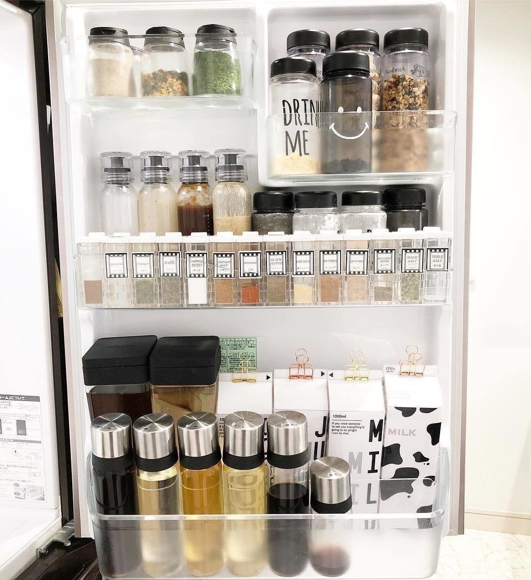 ___hiiiichan___さんのまるでショールームかスーパーマーケットのような冷蔵庫収納。ずらりとそろったスパイスが圧巻です。高さも揃えて取り出しやすそうです。