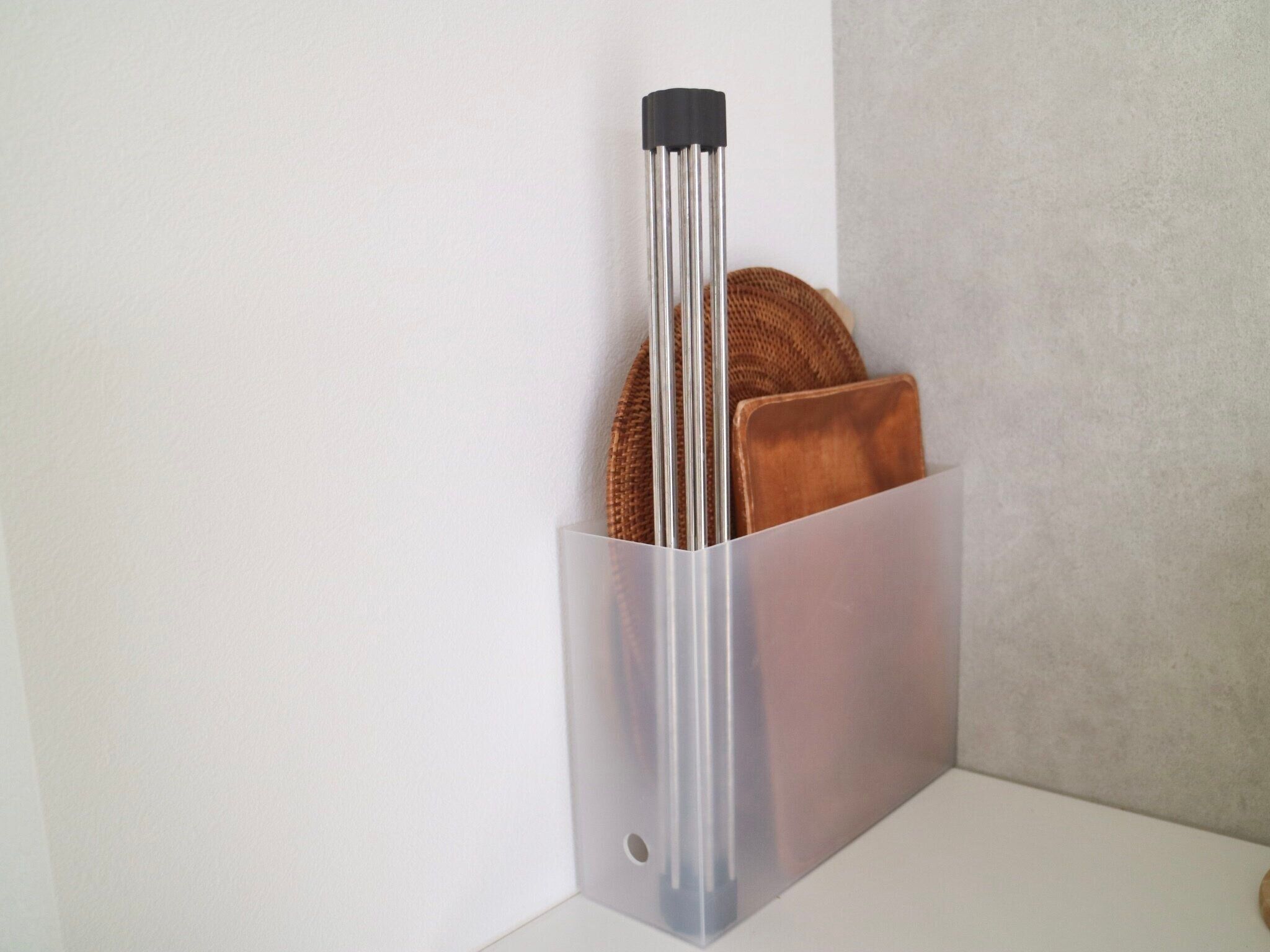 水切りかごは使わないときにも置いておくスペースが必要ですが、ケユカの水切り棚は、くるっとまるめることができるのが最大の魅力!わたしはキッチン背面棚の上に、トレイなどといっしょに無印良品のファイルボックスへ立てて収納しています。とてもコンパクトにまとまるのでまったく場所をとりません。