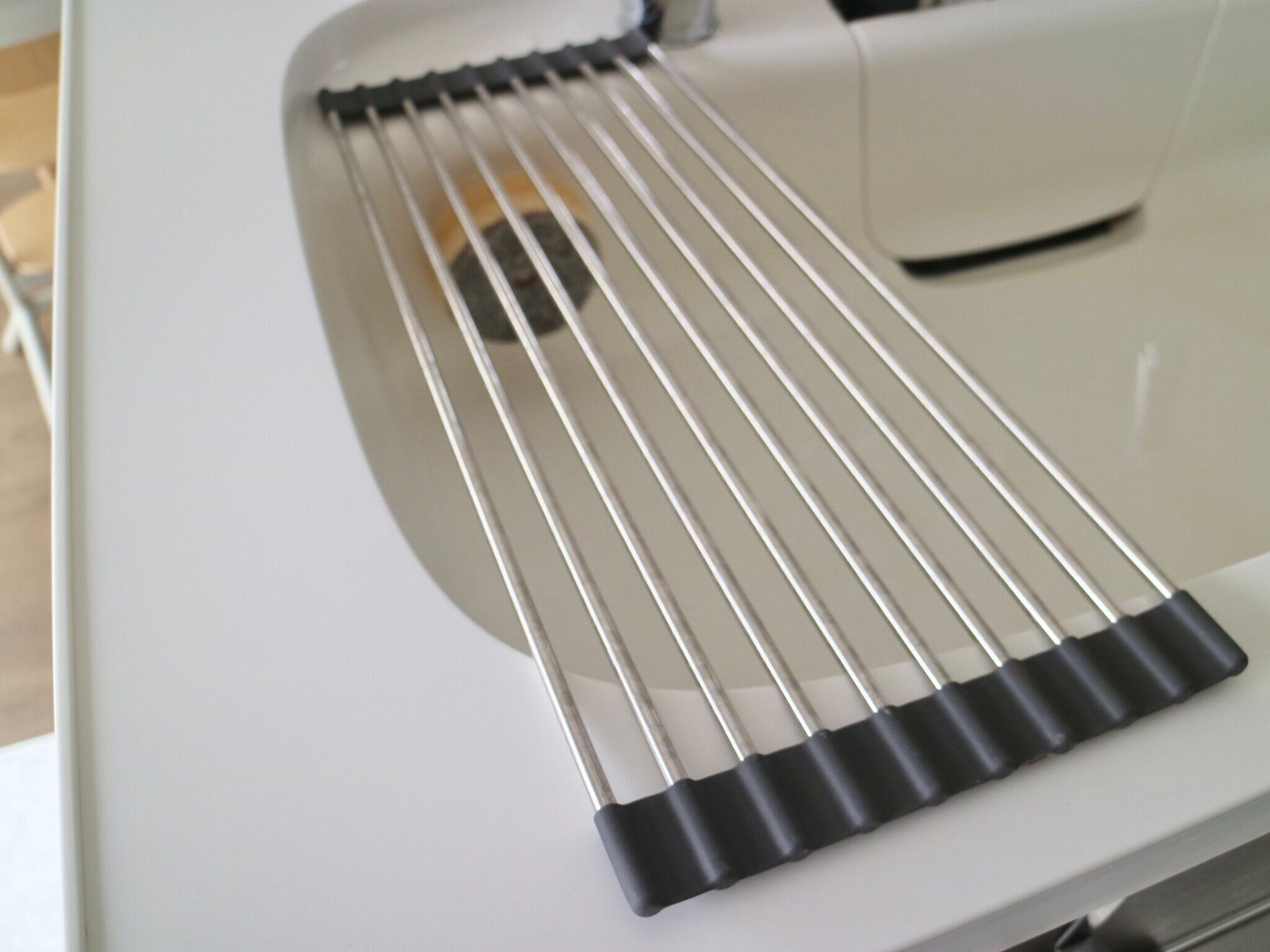 42cm以下のシンクに使用が可能で、シンクに渡して食器の水切りができるアイテムです。使わないときはくるくる巻いて収納できるすぐれもの。