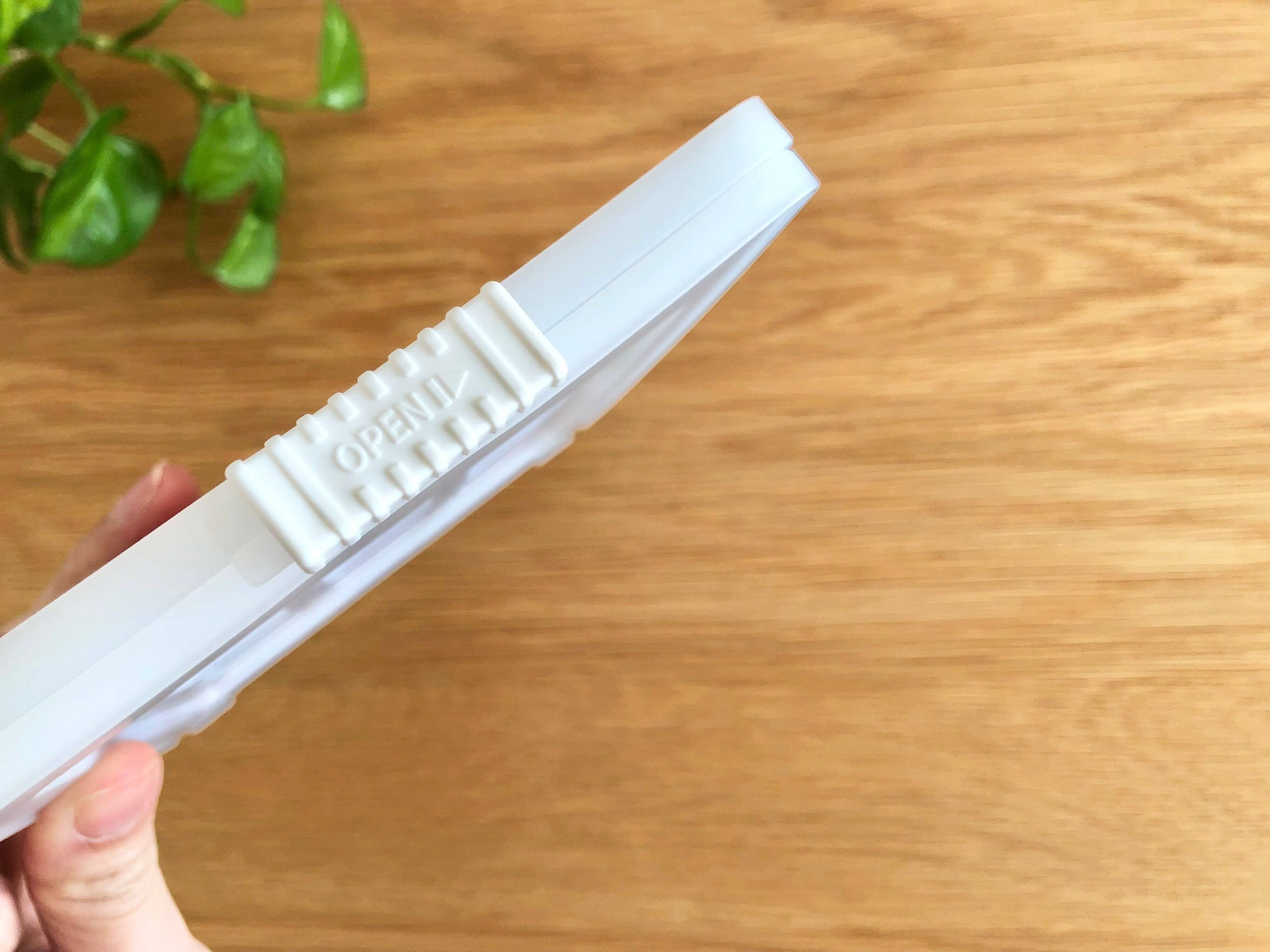 まず、本体のサイドにロックパーツがあるのでカチッと音が鳴るまでスライドさせて、本体を開きます。