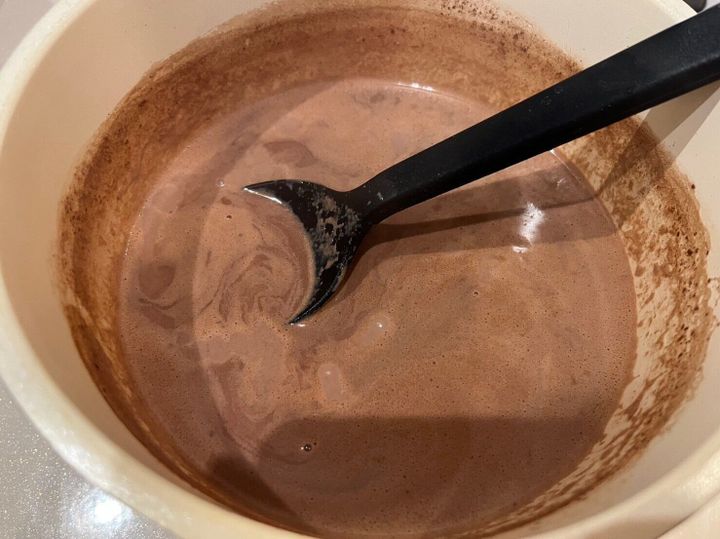 あたためた牛乳300mlにチョコレート5粒を溶かします。濃い目が好みであればチョコレートの数を増やしてもよいそうです。