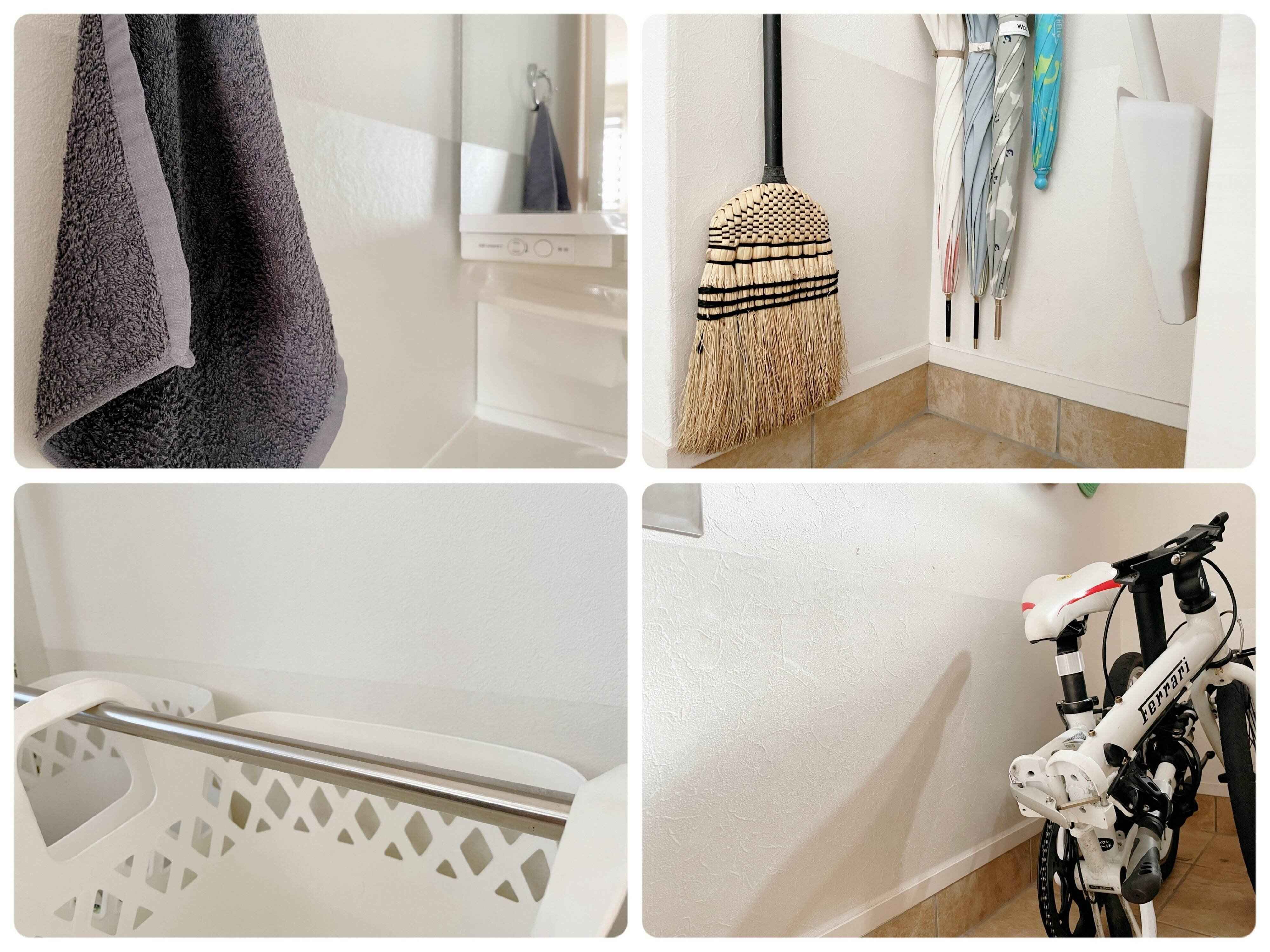 3番目に壁保護シートを設置したのは玄関の右側面。ほうきと傘を吊るし収納にしたこともあり、接地面の汚れを防ぐために設置しました。