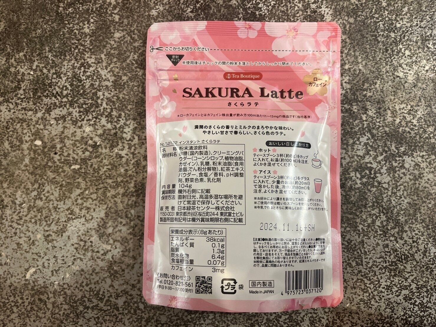 ローカフェインとは、カフェイン検出量が飲み方100mlあたり1〜13gの商品のことを指すそうで、こちらのさくらラテは1杯分(約8g)あたり3mgのカフェインが含まれているそうです。