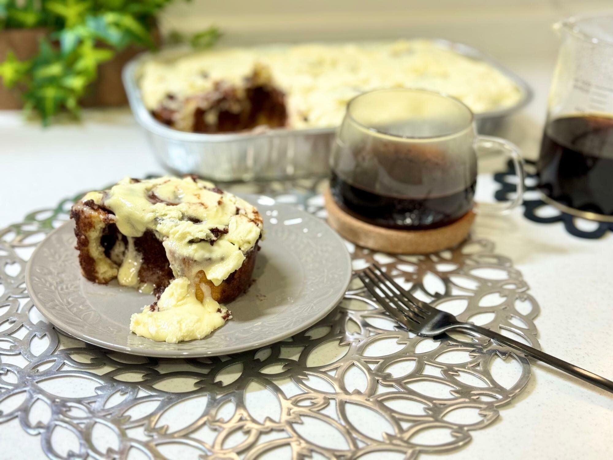 お皿に取り分けてレンジで温めるとチーズアイシングがとろりととけて、シナモンと甘くていい香りが部屋いっぱいに広がります。