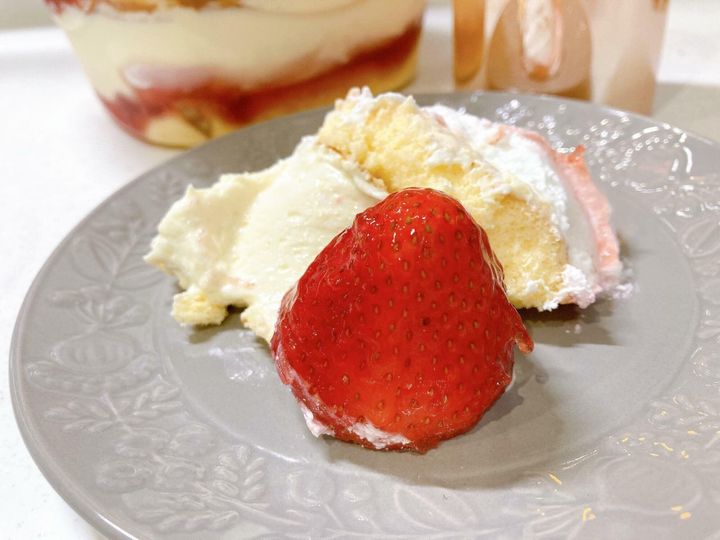 大きないちごがたくさんのった、コストコでは定番のケーキ。スポンジ、ストロベリーソースなど何層にも重なったケーキですが、たっぷりとはいっているのはカスタードクリーム。