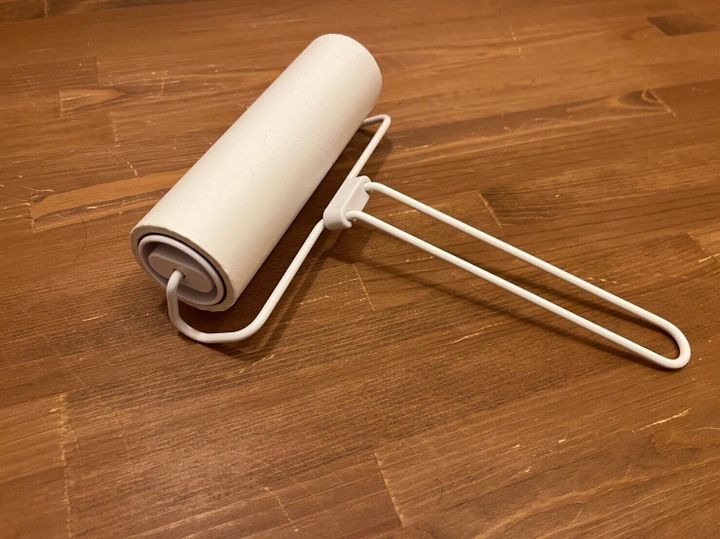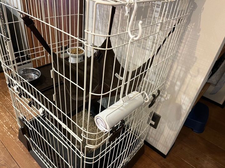 洋服などについた猫の毛をすぐに取ることができるよう、猫のケージにフックで引っ掛けています。