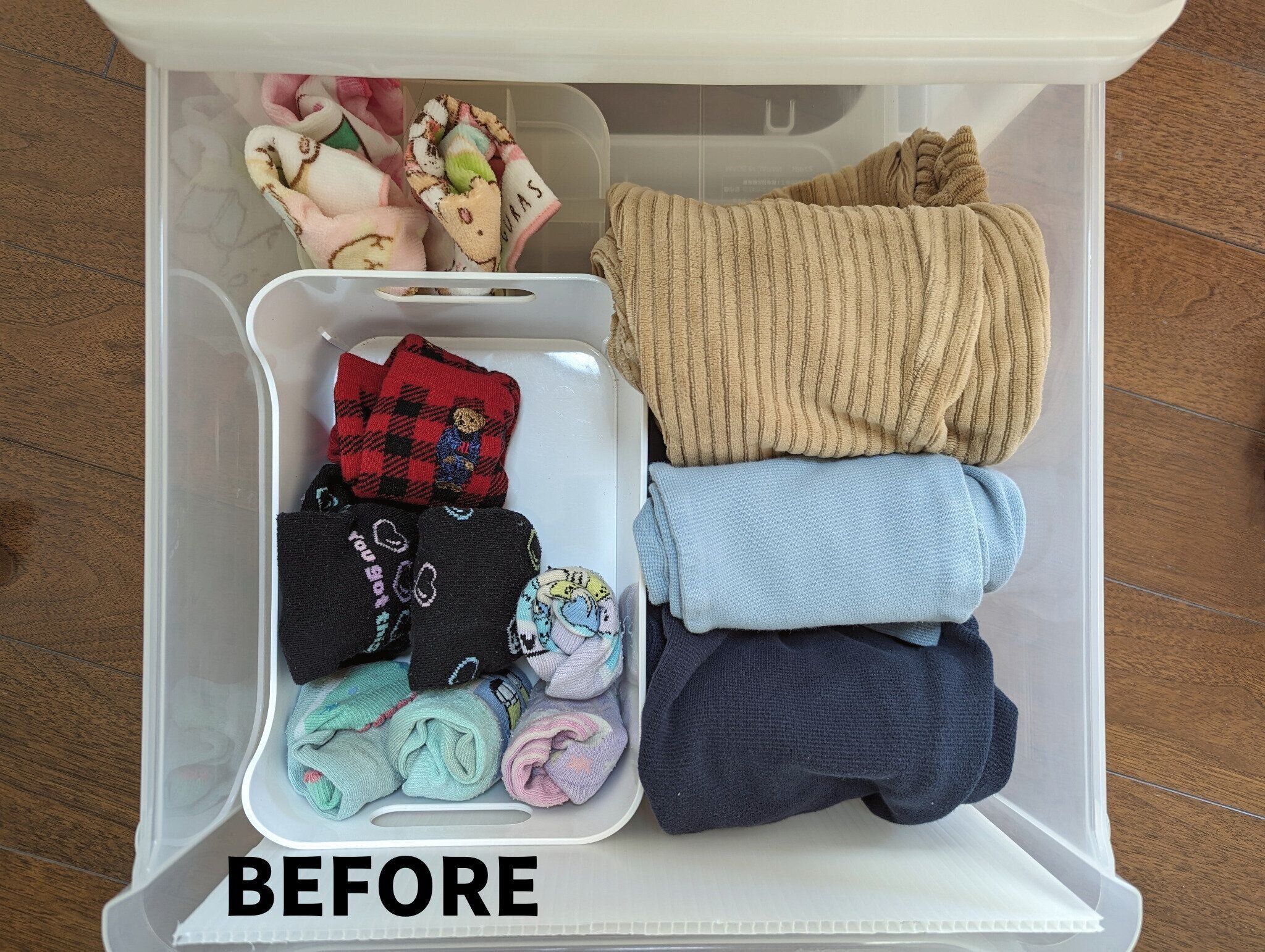 これまでは、下の写真のように、引き出し内をざっくりゾーン分け収納していたものの、小1の次女は動きがまだ稚拙。靴下やハンドタオルは、ひとつ取り出そうとすると横のもうひとつも一緒に飛び出てしまい、そのまま放置。わたしが洗濯物を片づけるタイミングで元に戻す、の繰り返しでした。