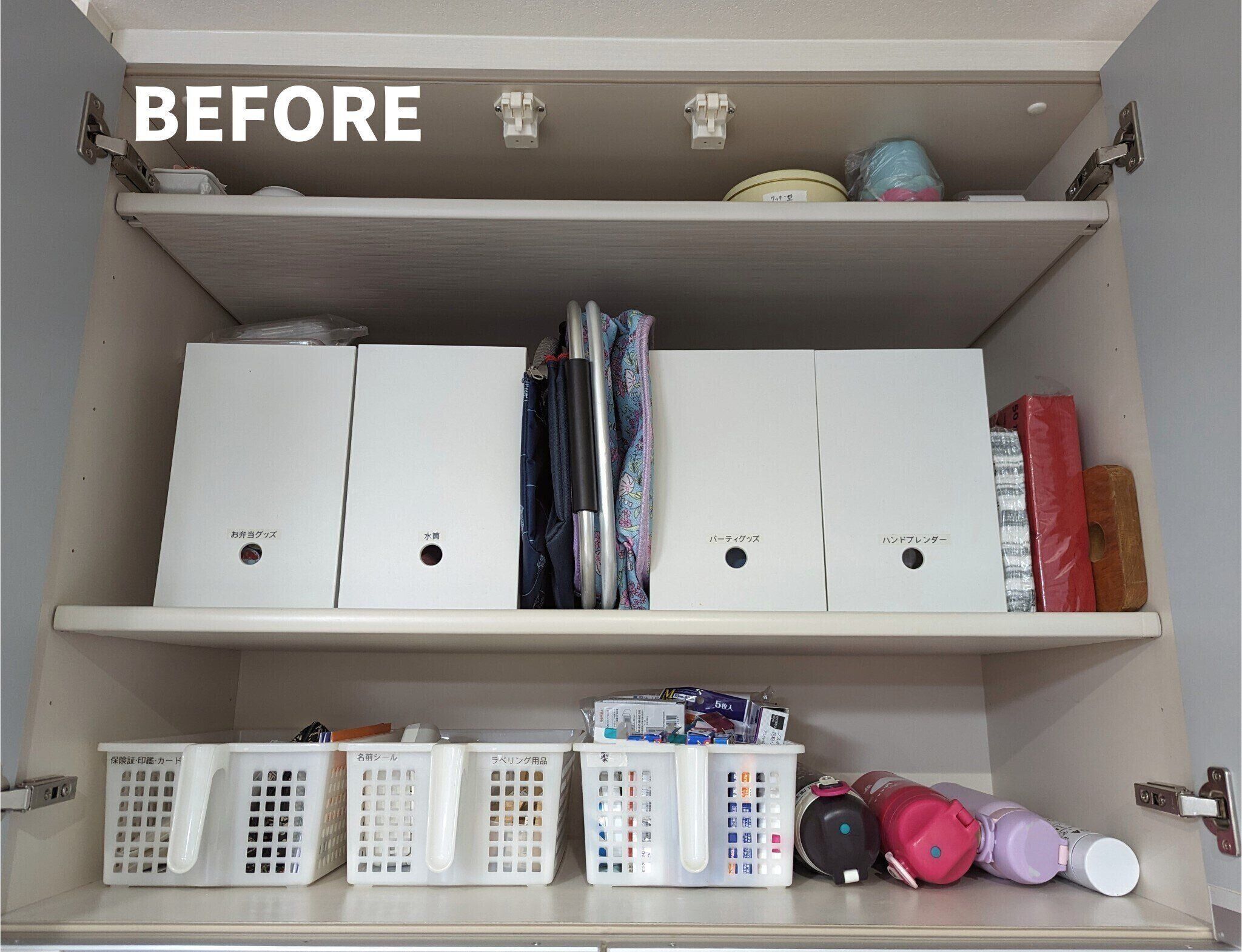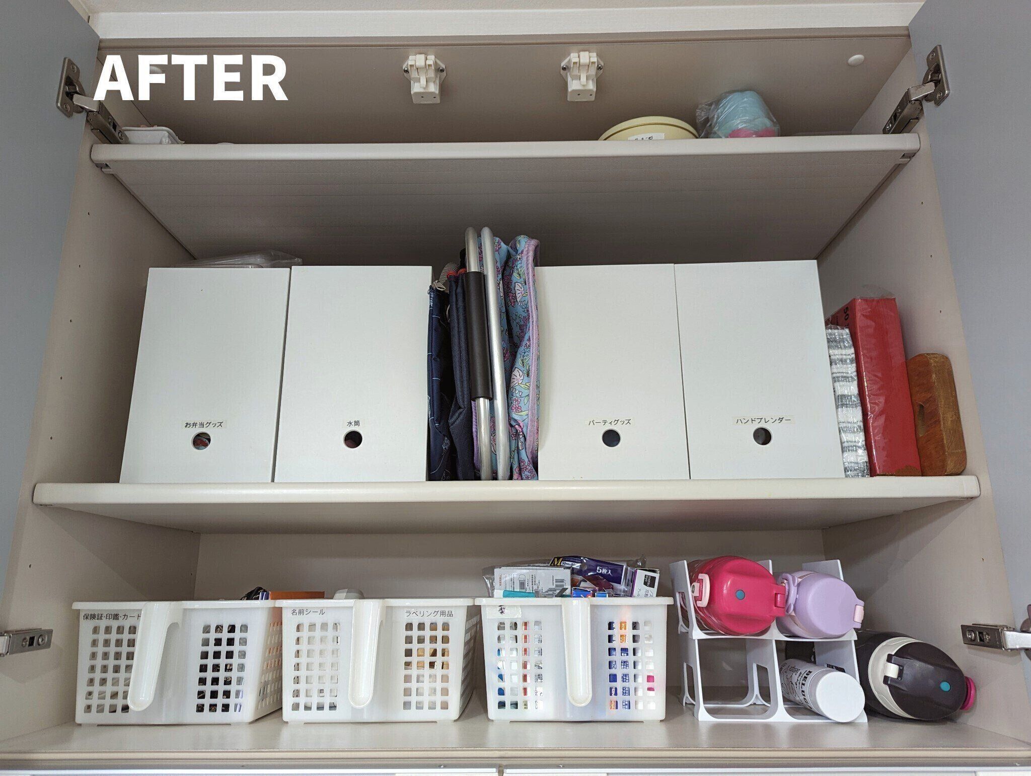 続いては、水筒収納問題。平日は、洗って乾かしたら翌朝また使うから、水筒の定位置は水切りカゴの中。出番のない週末や長期休み中は、キッチン背面収納の吊戸棚に収納しています。
