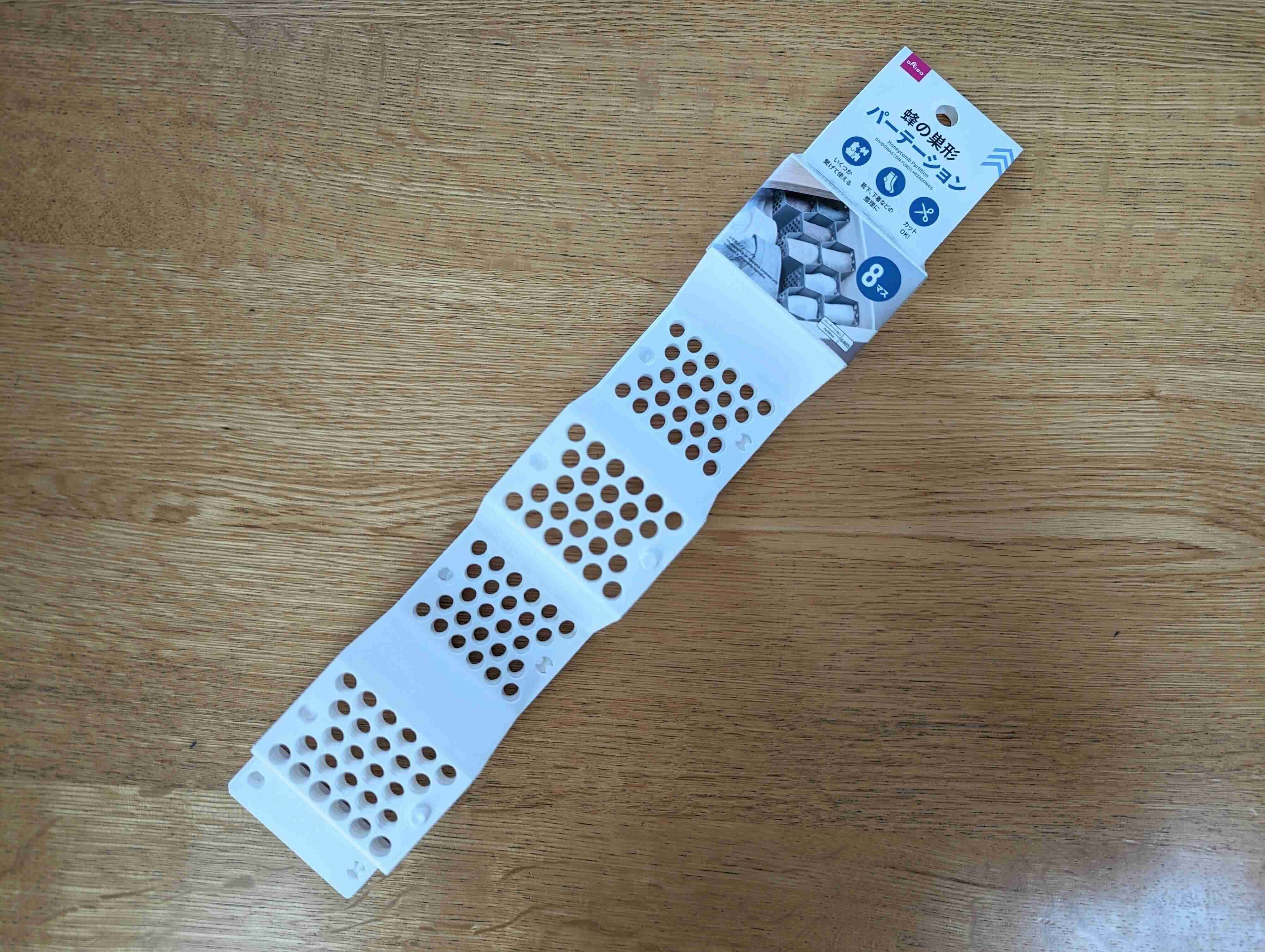 戻すひと手間はもちろん、引き出しを開けるたびにぐちゃっと乱れた風景が目に入るのがプチストレスだったので、仕組みを見直すことに。ダイソーパトロール中に見つけた「蜂の巣形パーテーション(8マス)」を購入しました。