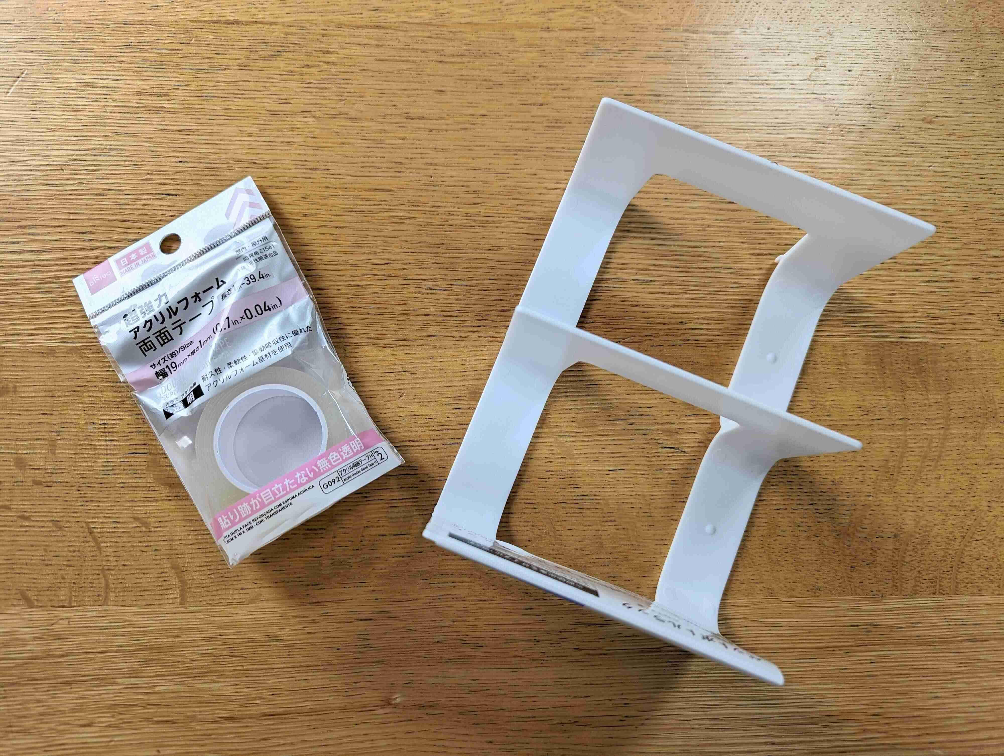 ダイソーで、「ペットボトルラック」2つと、ラックを固定する用の「超強力 アクリルフォーム両面テープ」を購入しました。