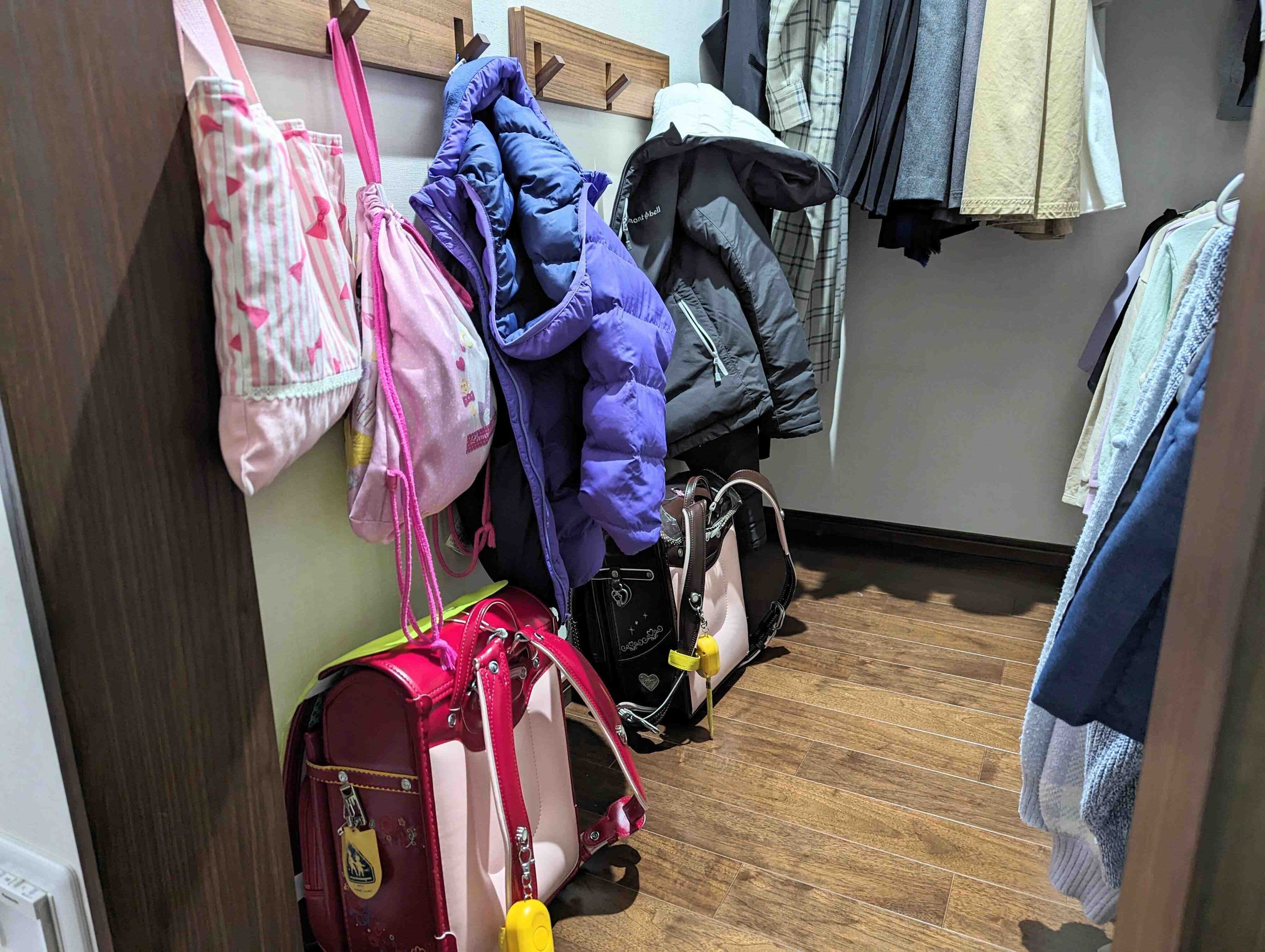 リビングで宿題と翌日の準備を終えたら、ランドセルはクローゼットへ移動させます。翌朝、クローゼットでアウターを着て、ランドセルを背負ったら「行って来ます!」という流れ。