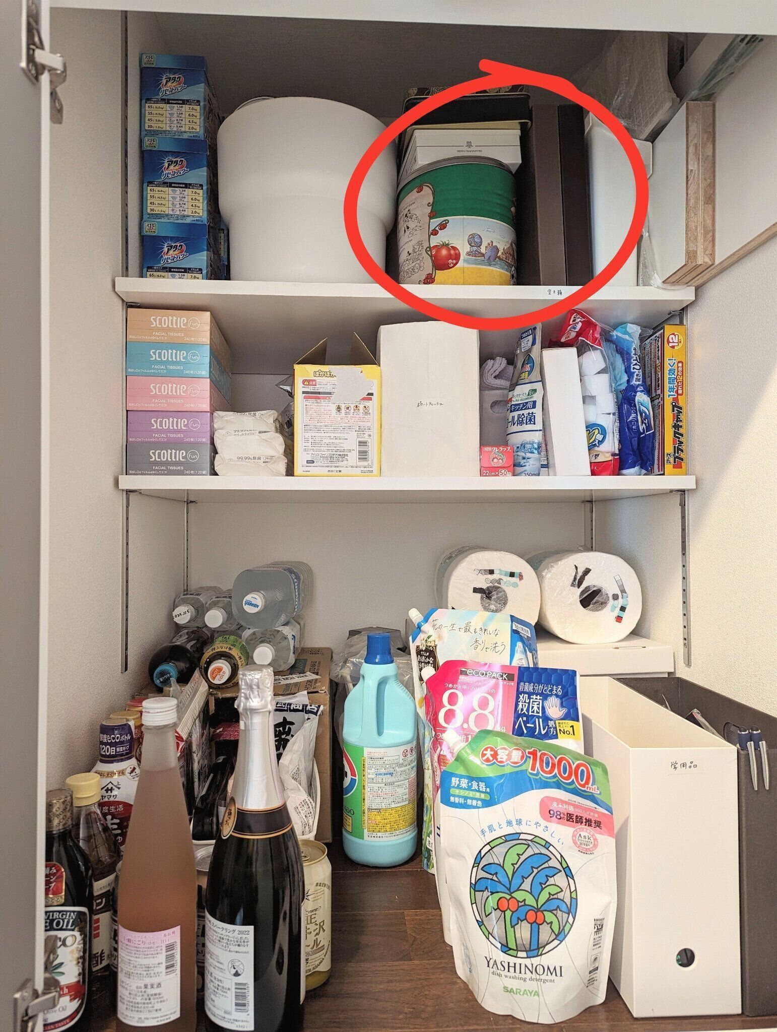 今はスペースを決めて、一定量をストックするように。食品や日用品の在庫を置いている棚の一部を廃材用にして、頻繁には出ないラップの芯や、いただきもののお菓子の箱などを中心に取っておくようにしています。