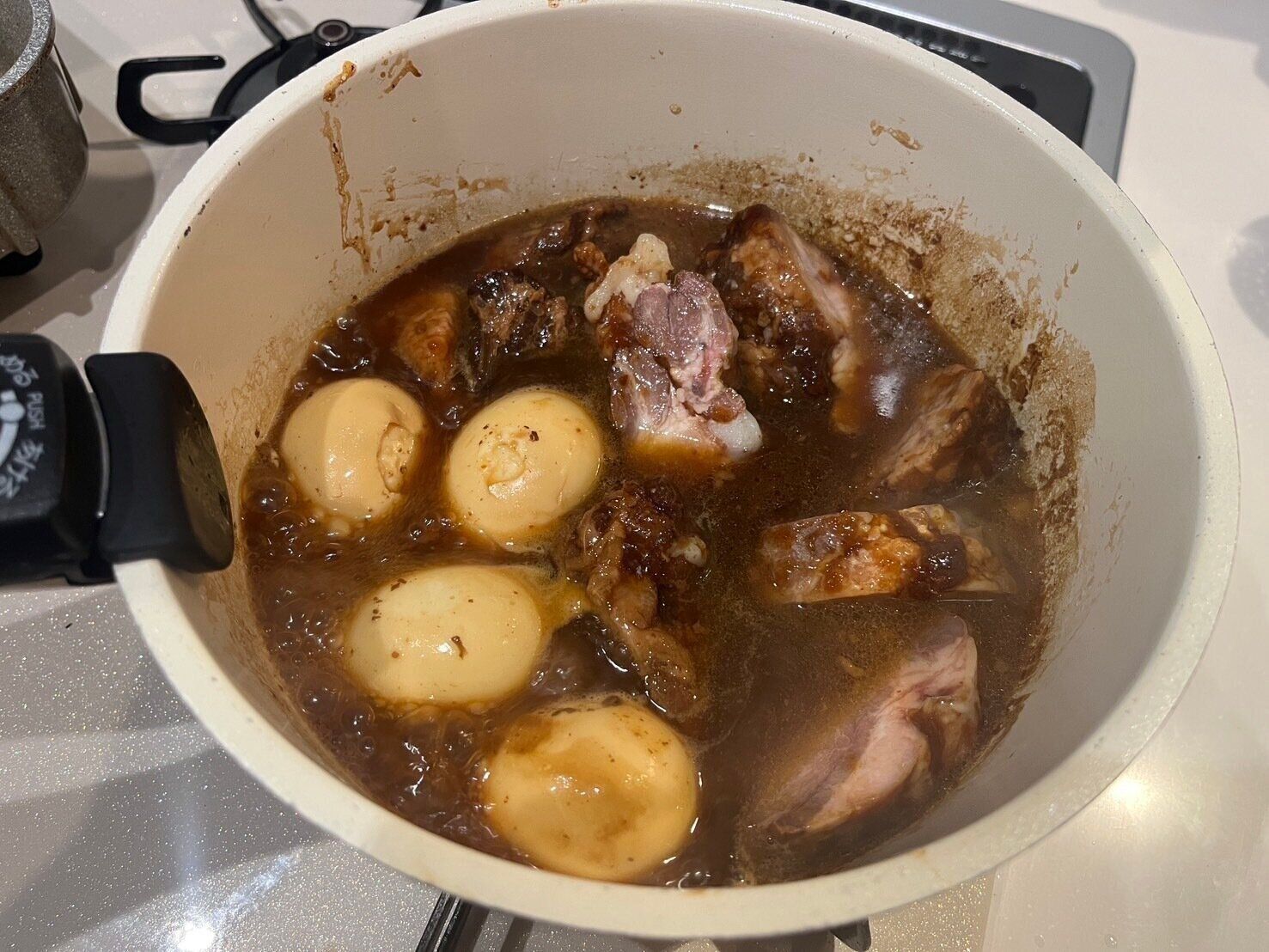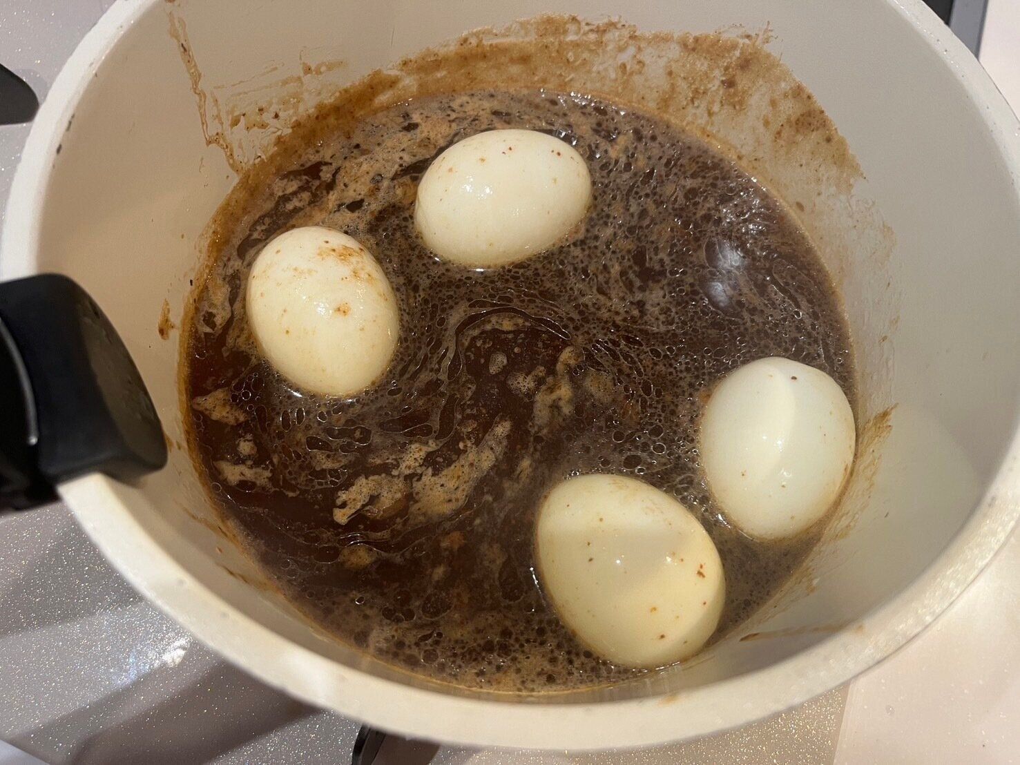 煮立ったらゆで卵を加えて少し煮詰めていきます。ゆで卵は今回4つ使いました。