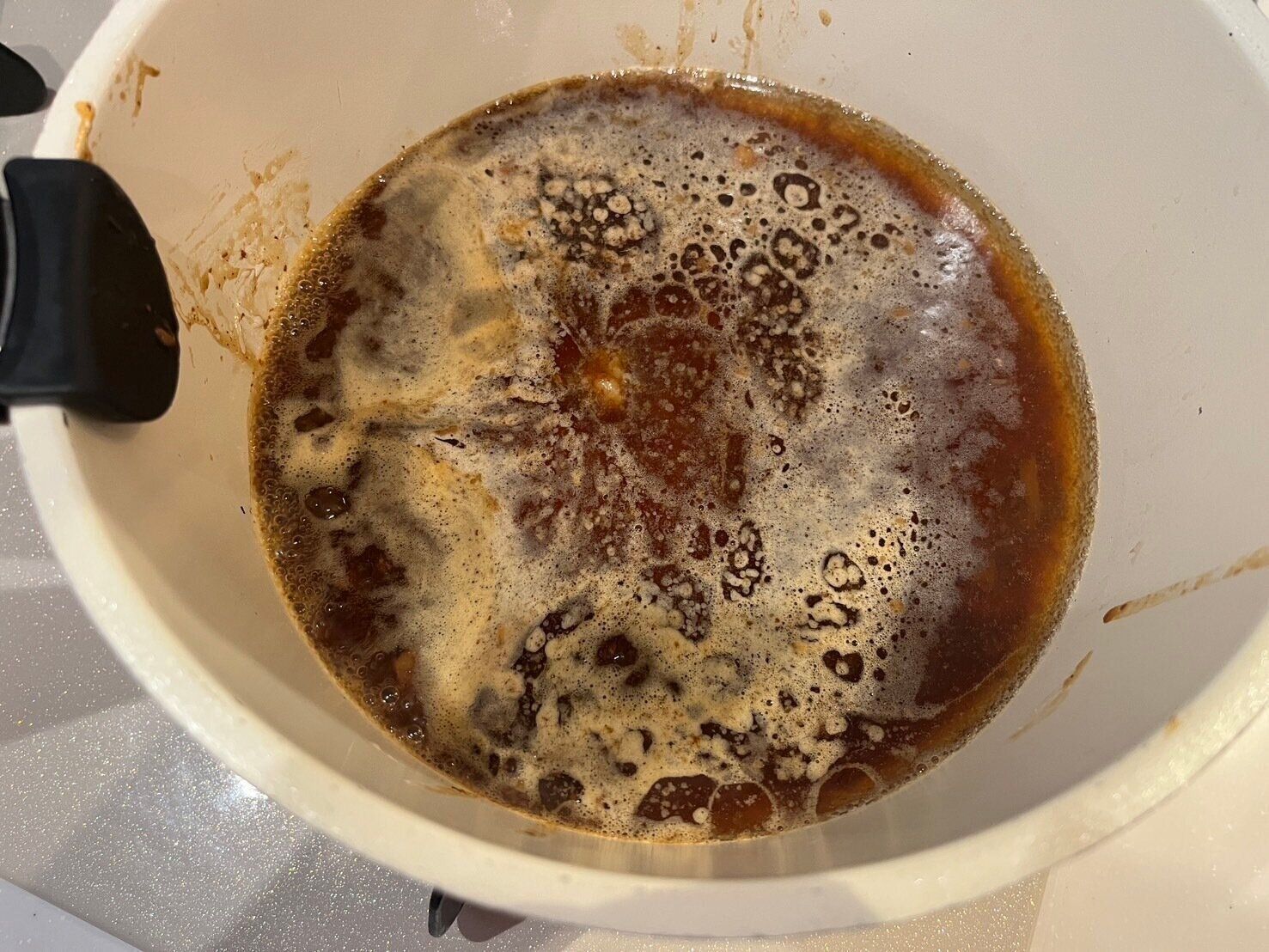 続いて、袋に残った煮汁と水300mlを鍋に入れて中火にかけます。