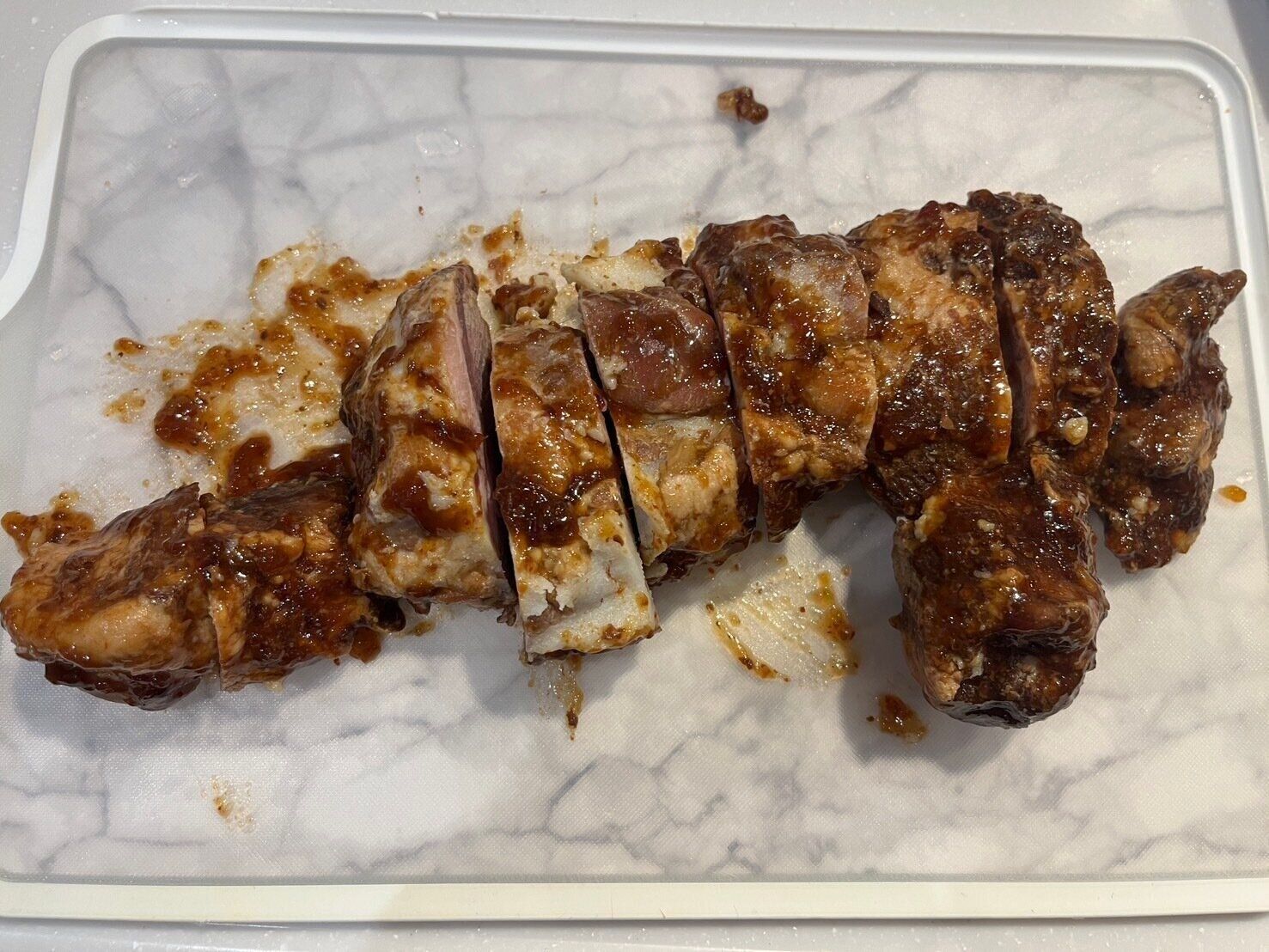 やわらか煮豚の袋を開けたらお肉を取り出します。加熱してから切り分けるのは大変なので、先に食べやすい大きさに切っておきます。